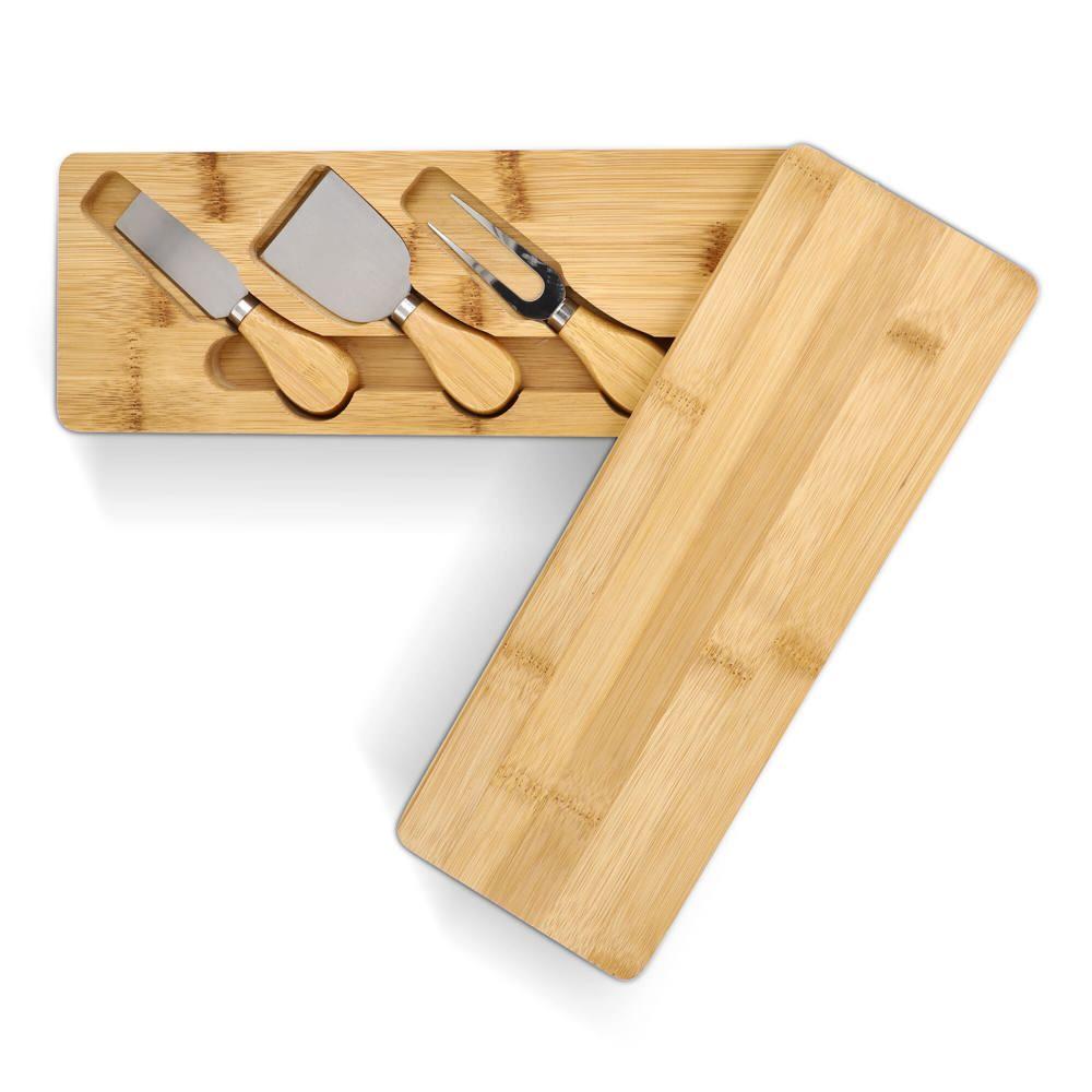 Ontdek de 3-delige bamboe kaasmessenset, perfect als gepersonaliseerd relatiegeschenk voor jouw bedrijf. Je krijgt drie messen speciaal ontworpen voor verschillende kaassoorten, verpakt in een stijlvolle bamboe doos die ook als serveerplank fungeert.