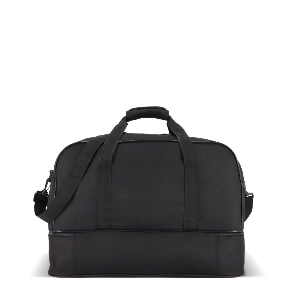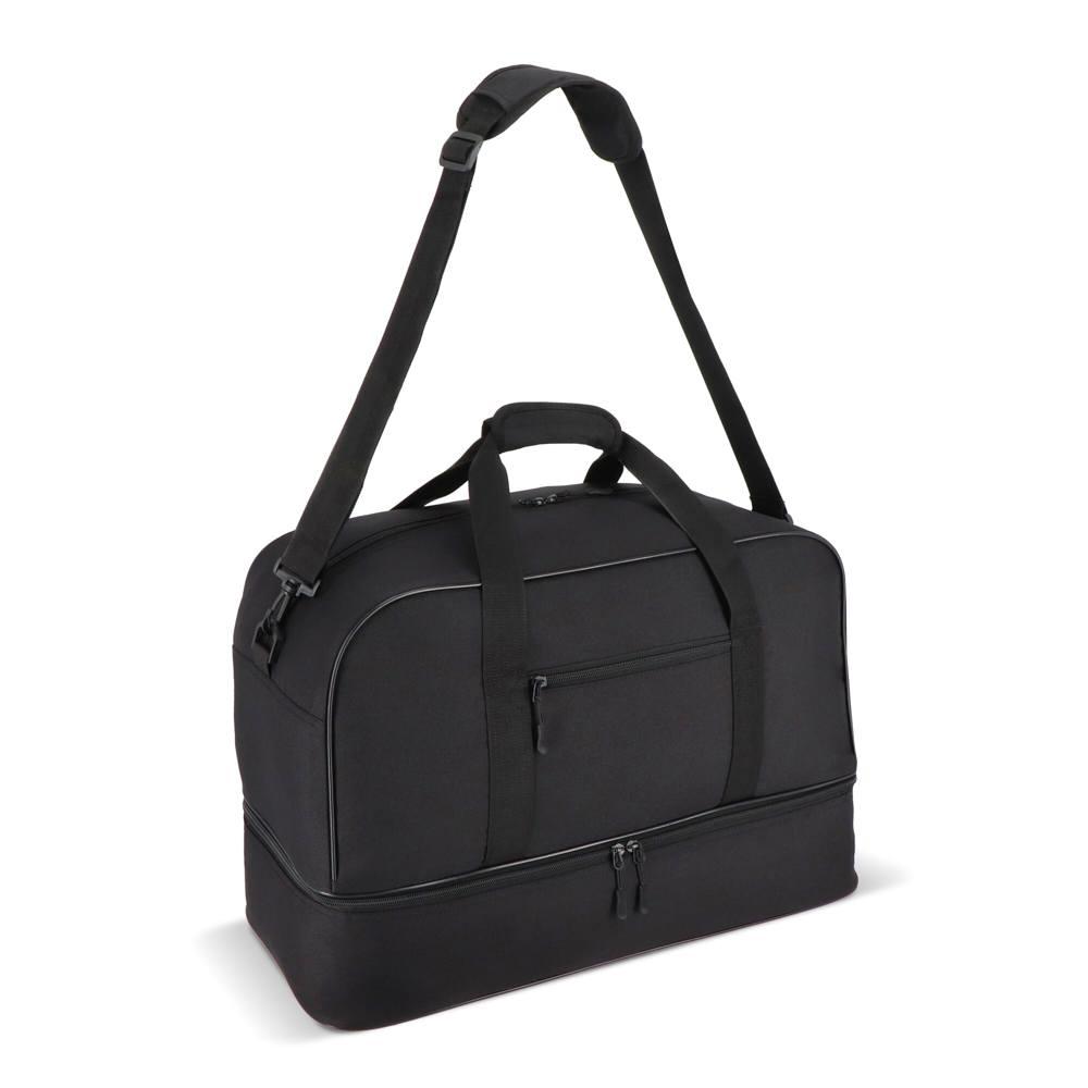 Je ontvangt een robuuste sport- en reistas van gerecycled 600D polyester, ideaal voor personalisatie met jouw logo als relatiegeschenk. De twee ruime vakken scheiden natte of vuile kleding perfect van droge spullen, zodat je schoenen of handdoeken apart houdt – superpraktisch voor reizen of sport.