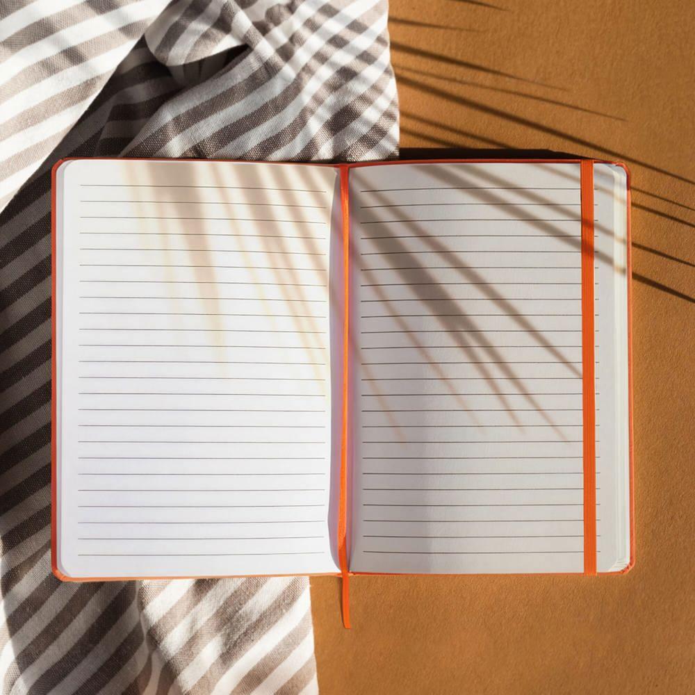 Ontdek dit klassiek ontworpen A5-notitieboek van PU-materiaal, perfect voor jouw gepersonaliseerde relatiegeschenken. Met een bijpassende elastische band en lintbookmark sluit je alles veilig af en markeer je snel je pagina. De 96 vellen wit gelinieerd papier bieden ruime notitieplek voor ideeën en actiepunten.