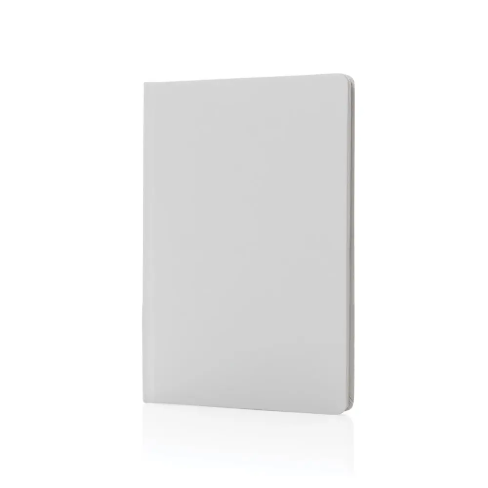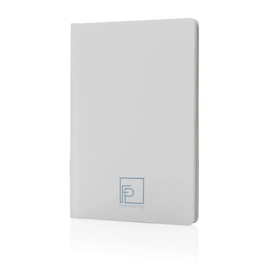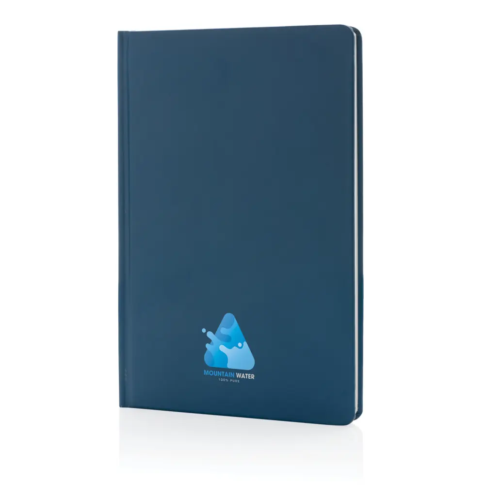 Ontdek ons Impact hardcover steenpapier notitieboek in A5-formaat, ideaal als gepersonaliseerd relatiegeschenk voor uw bedrijf. Met 128 gelinieerde pagina's van 58 g/m² biedt het ultra glad en zacht schrijfcomfort, dankzij het fluweelachtige steenpapier dat nul water gebruikt bij de productie. De volledige omslag bestaat eveneens uit dit duurzame materiaal, dat bio-gebaseerd en milieuvriendelijk is, zonder schadelijke stoffen zoals cadmium, lood, PAHS, phthalaten of gechloreerde paraffines.