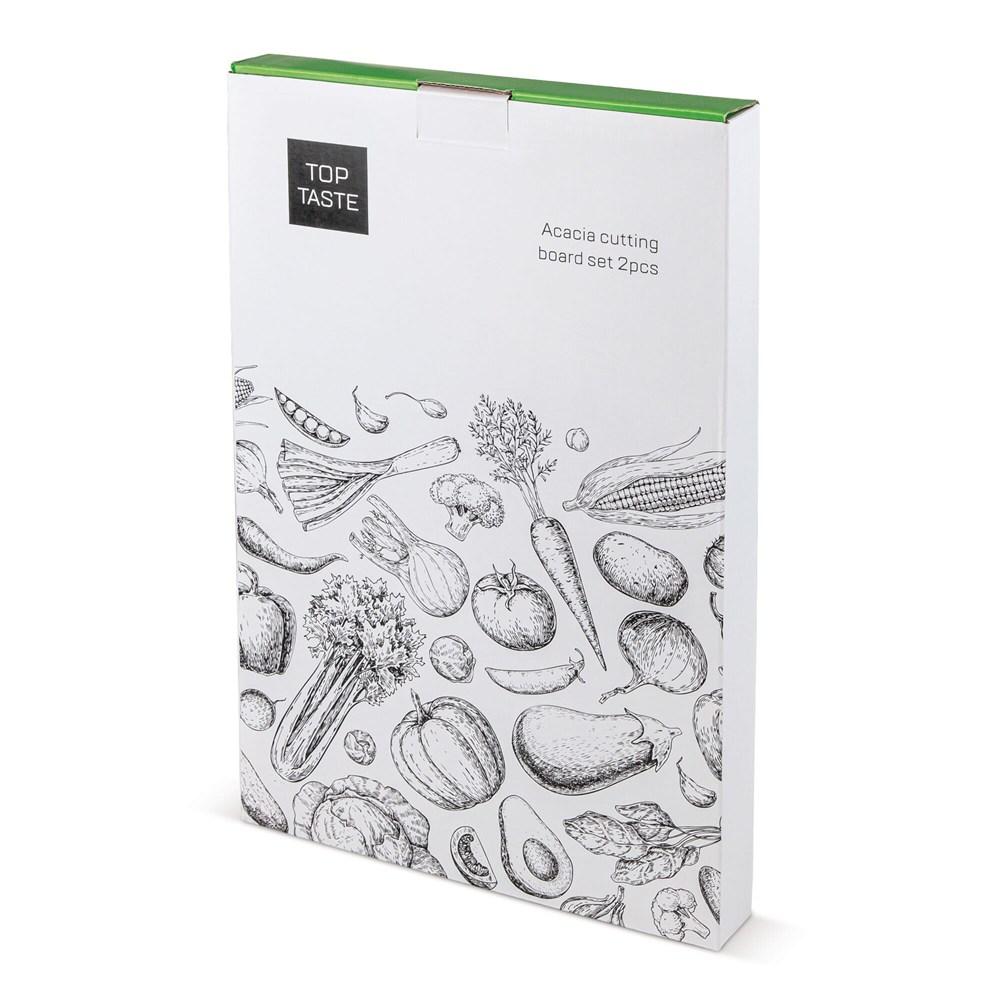 Twee kwalitatief hoogwaardige snijplanken van acasia hout. Te gebruiken als snijplank, maar misstaat ook niet als hapjes serveer plank. Luxe afwerking met een lederen lus en verpakt in een mooie geschenkverpakking.
