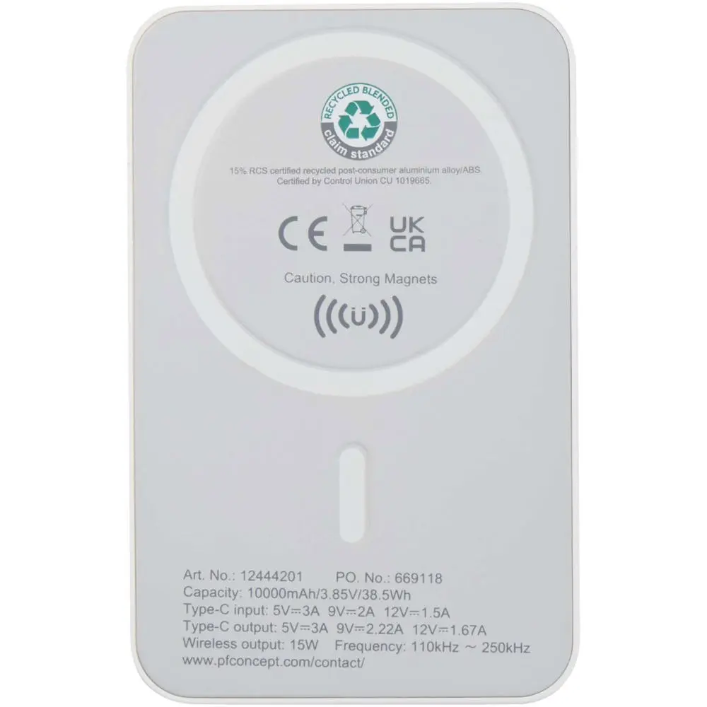 Ontdek de compacte Acrab powerbank met 10.000 mAh capaciteit, vervaardigd uit gerecycled ABS-kunststof. Deze duurzame oplossing biedt u maximaal 15 W magnetisch draadloos opladen voor compatibele smartphones, zoals iPhone 12 en recentere modellen. Voor apparaten zonder magnetische technologie wordt een metalen ringsticker bijgeleverd, zodat u een optimale uitlijning verkrijgt.