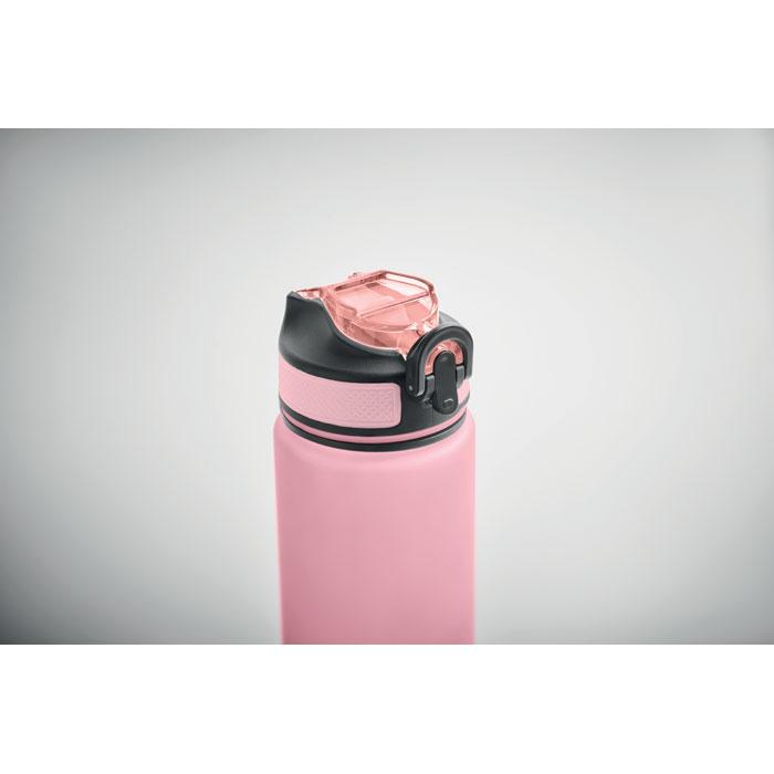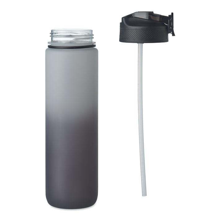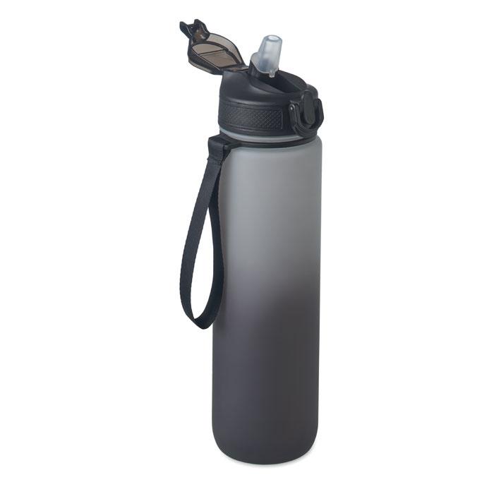 Sportwaterfles van RPET met ingebouwd rietje, zachte siliconen tuit, motiverende tijdsaanduiding, met één hand te openen flip top deksel, veiligheidsslot en draagband. Lekvrij. Inhoud 1L.