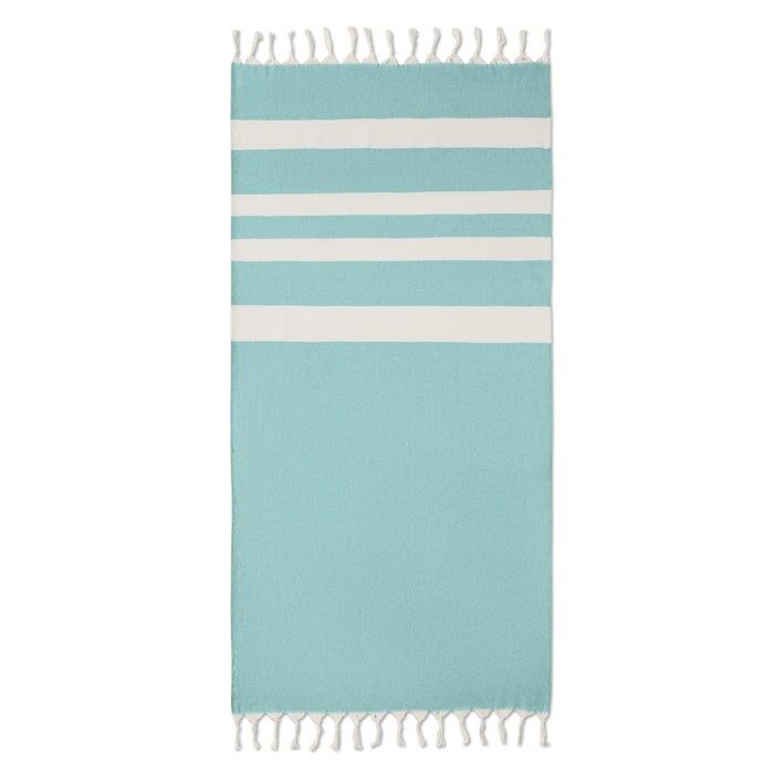 De AGOURA Hammam handdoek van 140 gr/m² is een duurzaam strandlaken, vervaardigd uit 45% gerecycled katoen en 55% gerecycled polyester (RPET). Dit milieuvriendelijke materiaal combineert zachtheid met snelle droogtijd, ideaal voor ontspannende momenten aan het strand of in de hammam.