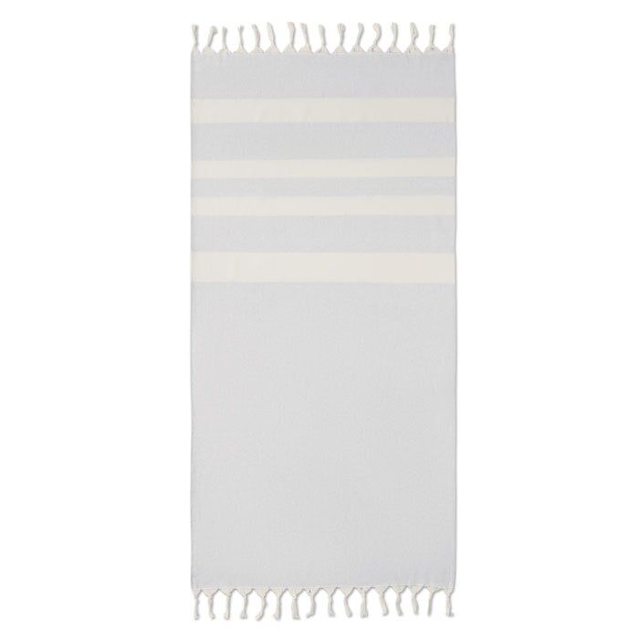 Ontdek onze hammam strandlaken gemaakt van gerecyclede materialen. Deze handdoek combineert gerecycled katoen (45%) met gerecycled polyester (55%) en weegt slechts 140 gr/m², wat zorgt voor een licht en compact ontwerp ideaal voor stranddagen of ontspanningsmomenten.