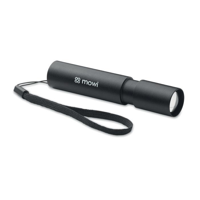 Aluminium oplaadbare zaklamp van 110 lumen met 3 lichtstanden en in-/uitzoomfunctie. Inclusief ingebouwde oplaadbare batterij van 400 mAh en oplaadkabel.