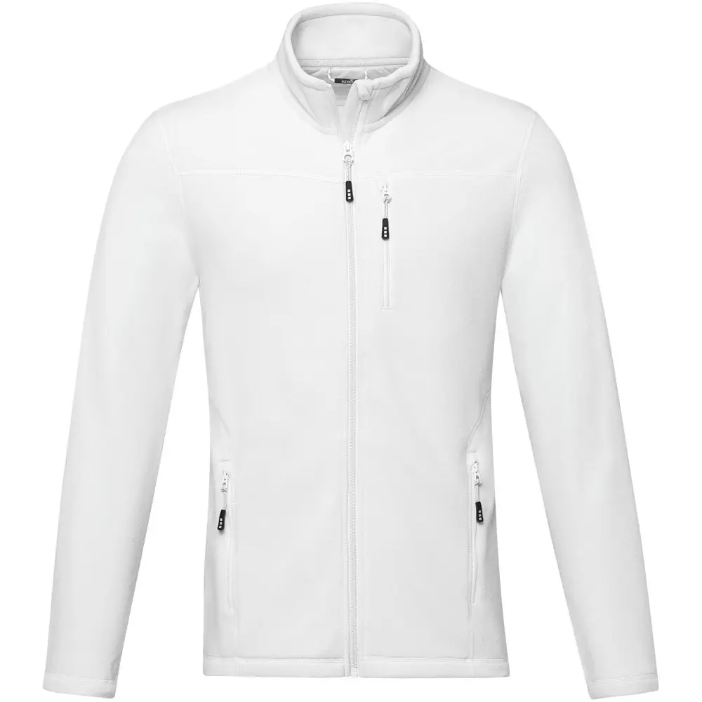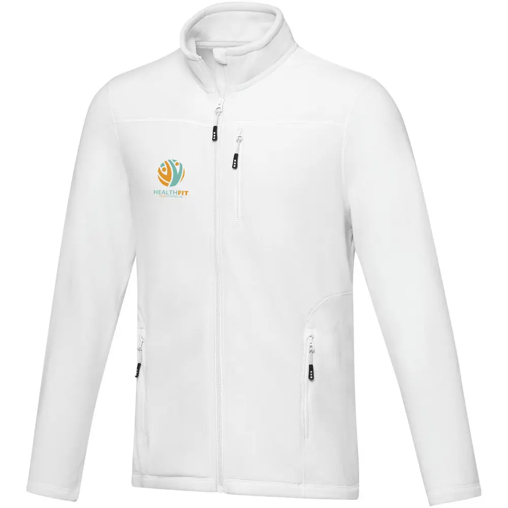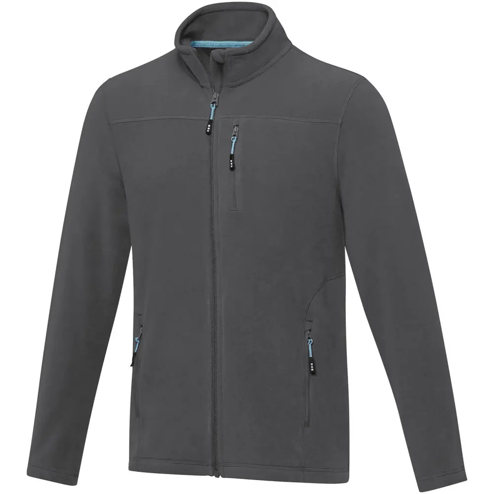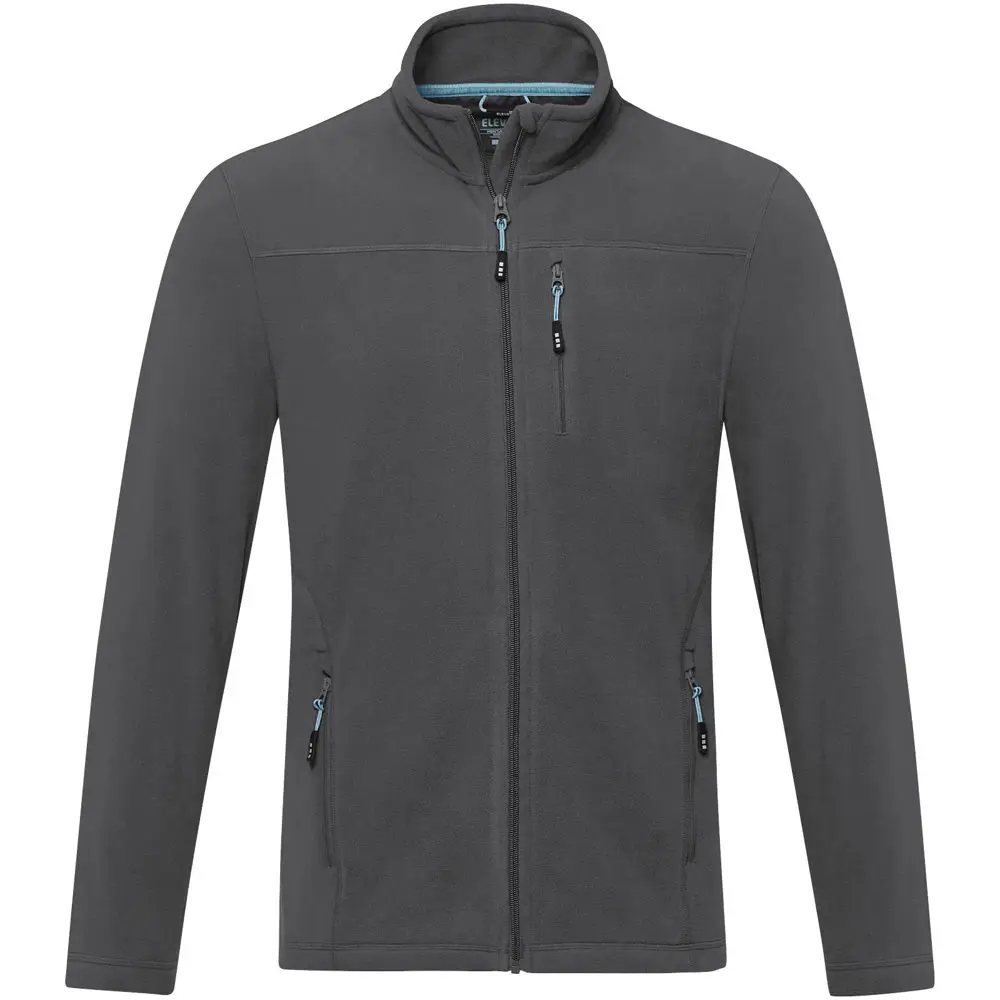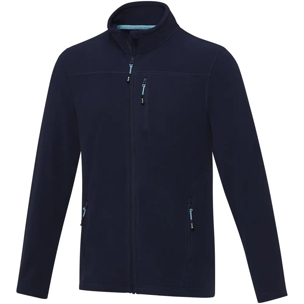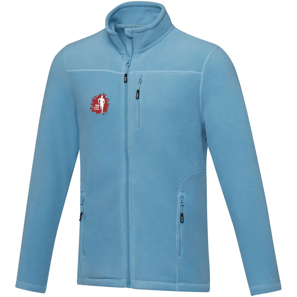 De Amber heren fleece jas met volledige rits is een stijlvol en functioneel kledingstuk, ideaal als gepersonaliseerd relatiegeschenk voor uw marketingacties of events. Gemaakt van micro fleece uit 100% GRS-gecertificeerd gerecycled polyester (174 g/m²), biedt het een optimale balans tussen warmte, lichtheid en duurzaamheid. De volledige rits vooraan, binnenstormflap met kinbeschermer en ritssluitingen op de voor- en borstzakken zorgen voor comfort en bescherming tijdens outdooractiviteiten.