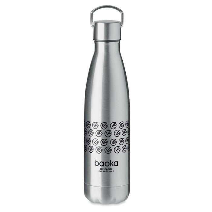 Dubbelwandige roestvrijstalen fles met koperen isolerende vacuümeigenschappen en deksel met handvat. Inhoud 500 ml. Lekvrij.
