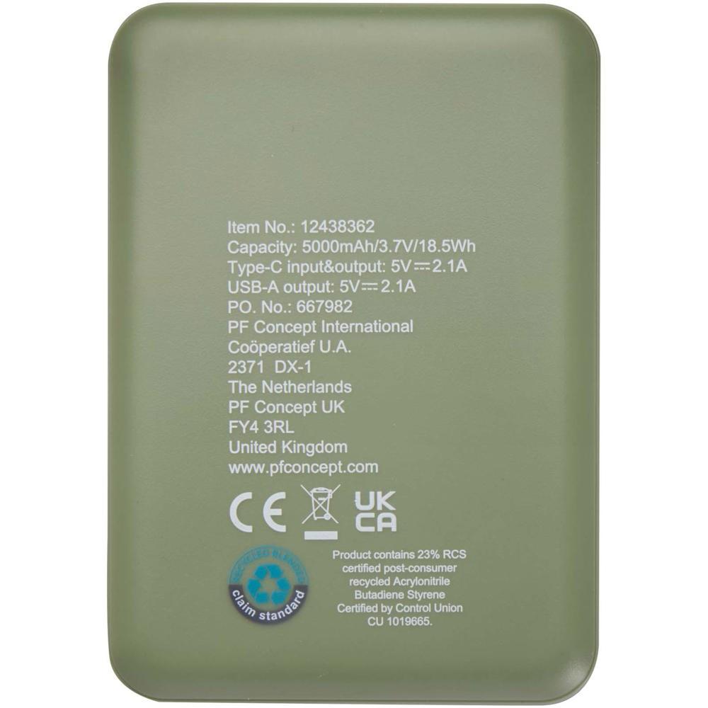 De krachtige 5000 mAh lithium-polymeerbatterij levert een maximaal uitgangsvermogen van 10 W, ideaal voor smartphones, tablets en accessoires tijdens events of als dankje aan klanten. Gemaakt van 23% RCS-gecertificeerd gerecycled plastic, benadrukt deze powerbank jouw duurzame imago en trek je milieubewuste partners aan.