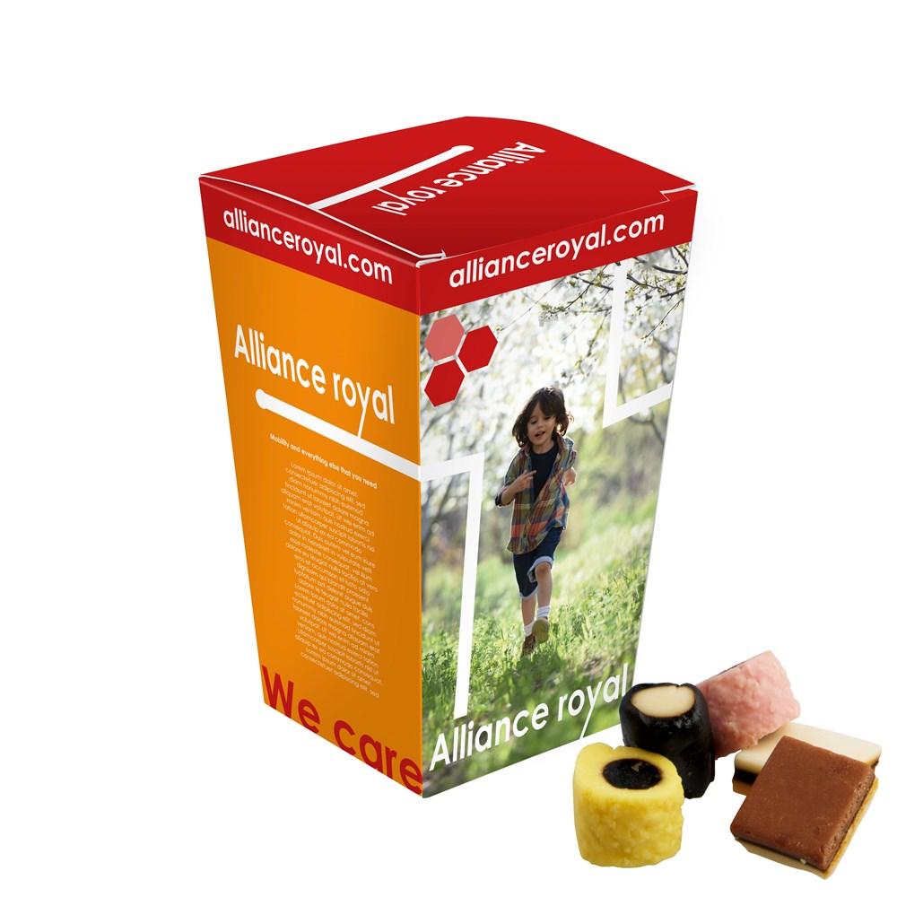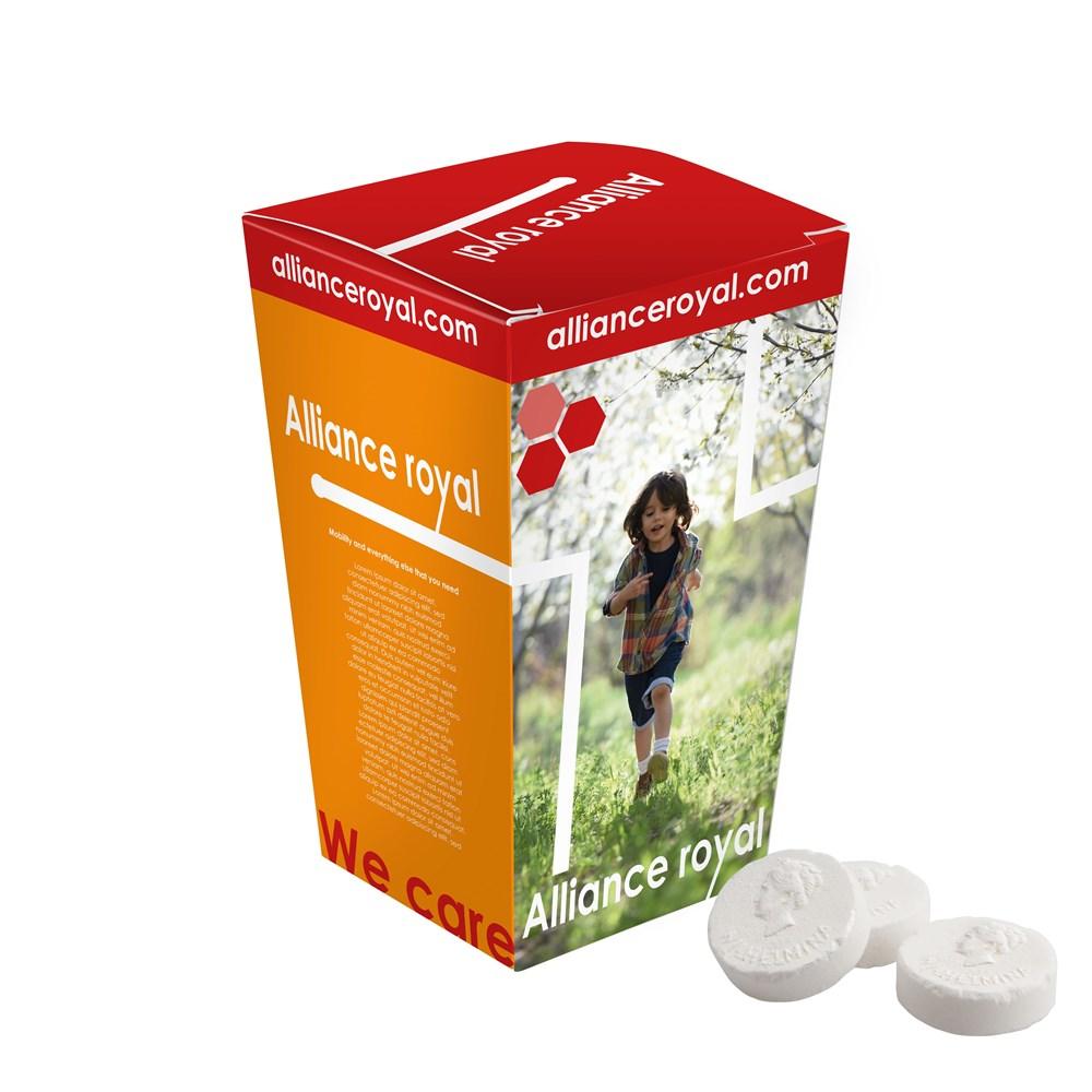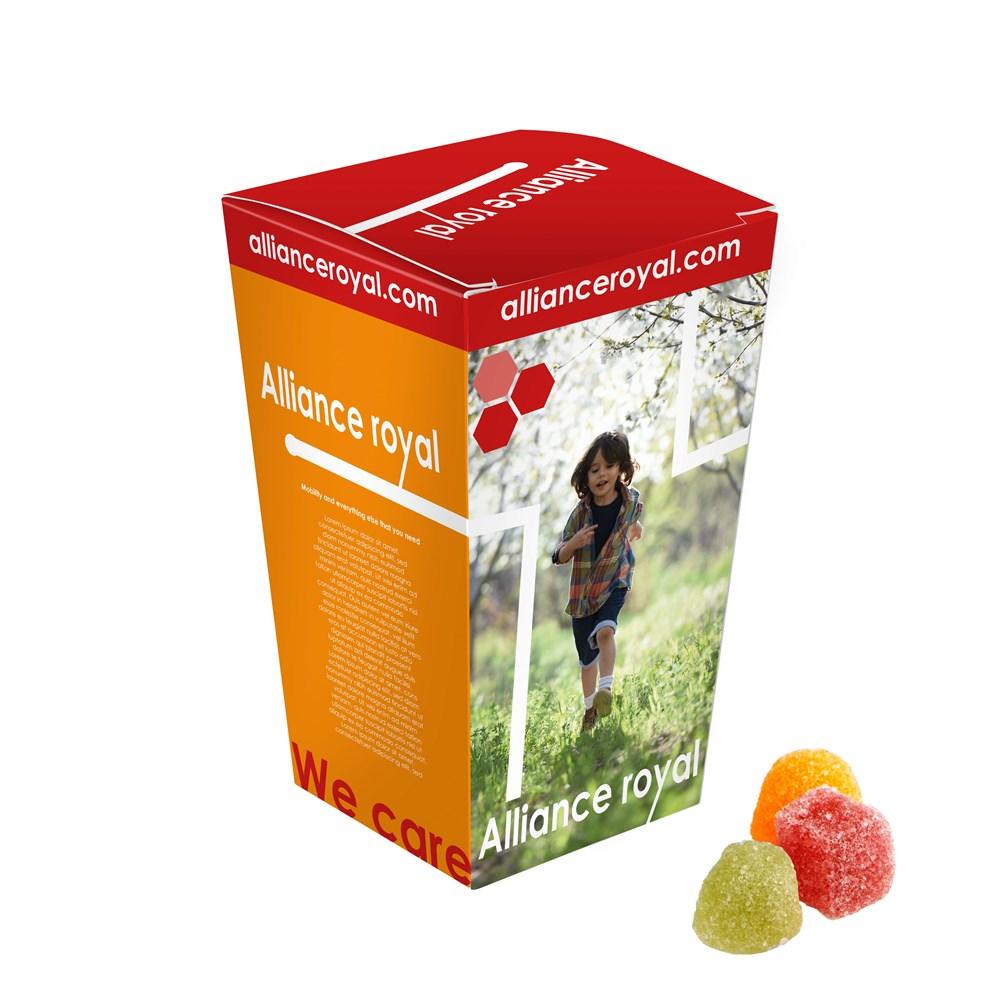 Full colour bedrukt doosje voor in de autobekerhouder, gevuld met ca. 250 gram Dropstaafjes