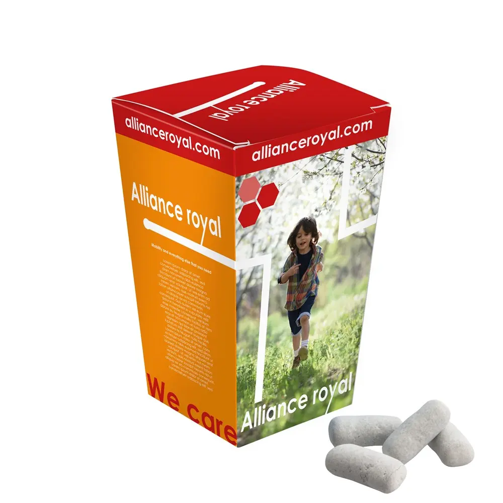 Ontdek ons full colour bedrukt doosje dat perfect past in de autobekerhouder van uw auto. Dit handige papieren doosje is gevuld met ongeveer 250 gram dropstaafjes, ideaal als gepersonaliseerd relatiegeschenk met uw logo.