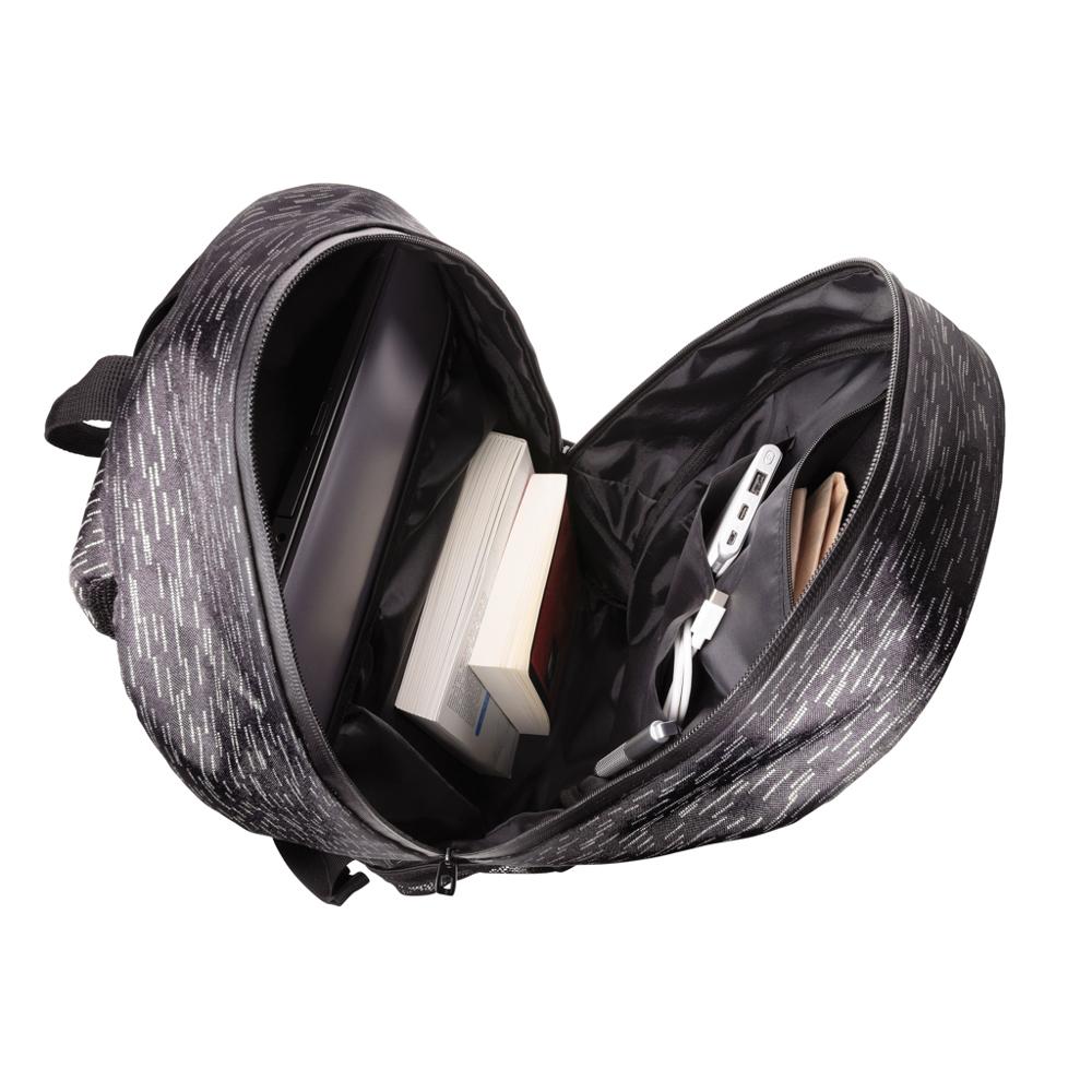De moderne allover reflecterende print maakt je superzichtbaar, perfect voor events en promotie. Het ruime hoofdvak past een 15,6 inch laptop, met voorvak op rits en 2 mesh vakken voor extra opbergplek. Verstelbare schouderbanden zorgen voor comfortabel dragen. PVC-vrij en gemaakt van 16 plastic flessen, met 8 liter waterbesparing.