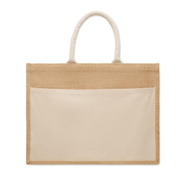 Ontdek deze duurzame jute boodschappentas, perfect als gepersonaliseerd relatiegeschenk voor jouw marketingcampagnes of events. Gemaakt van gelamineerde jute met stevig 280g/m² katoenen canvas en praktische koordhandvatten. Het grote open voorvak biedt ruimte voor extra promotiemateriaal.