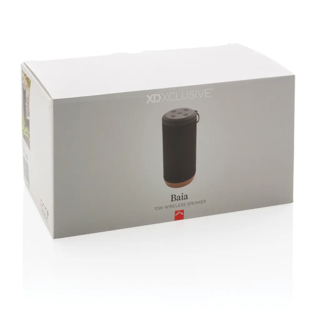 De Baia 10W draadloze speaker is uw ideale keuze voor duurzame relatiegeschenken met logobedrukking. Gemaakt van waterdicht polyester en kurk, biedt deze speaker een robuuste bouw die bijdraagt aan een milieubewuste uitstraling van uw merk.