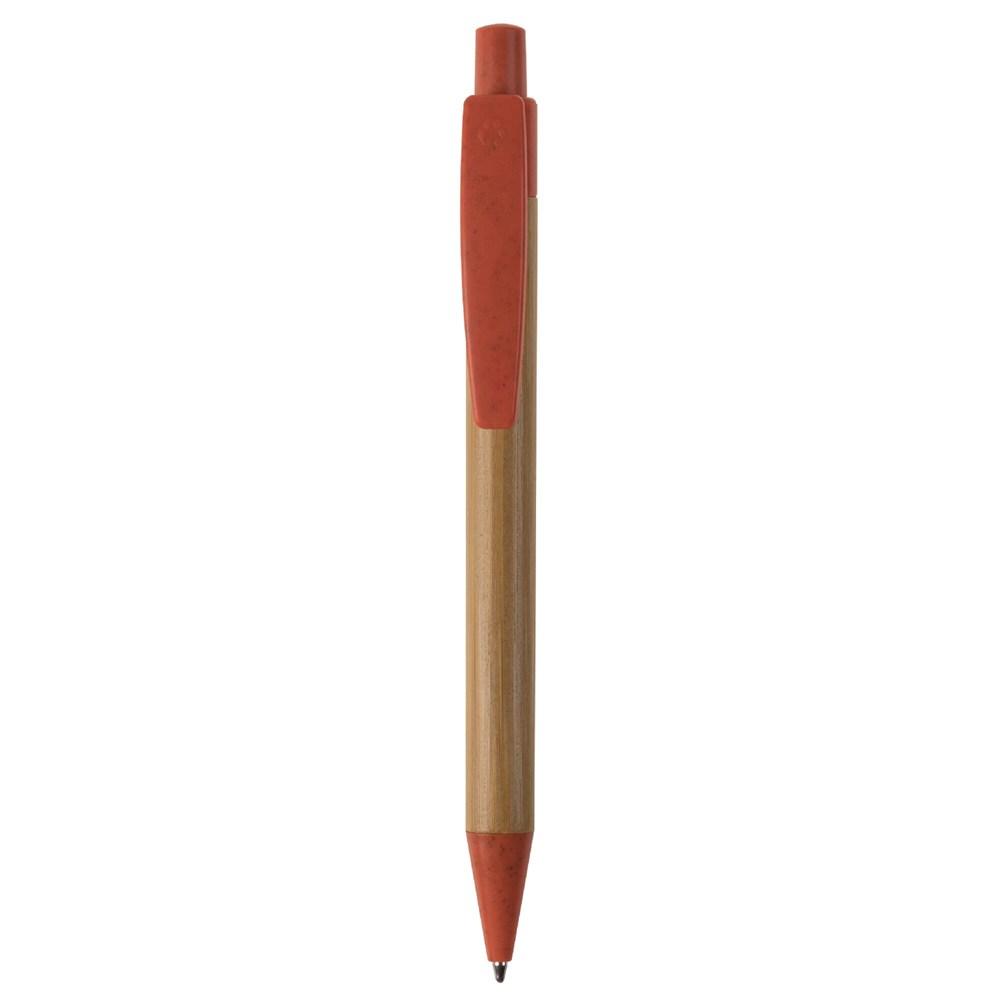 Balpen van bamboe materiaal met een clip, drukker en punt gemaakt van tarwestro. Bevat een kunststof blauwschrijvende X20 vulling.