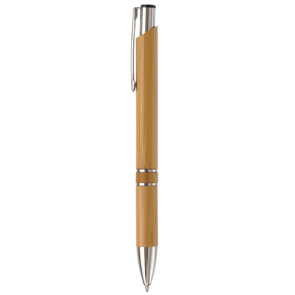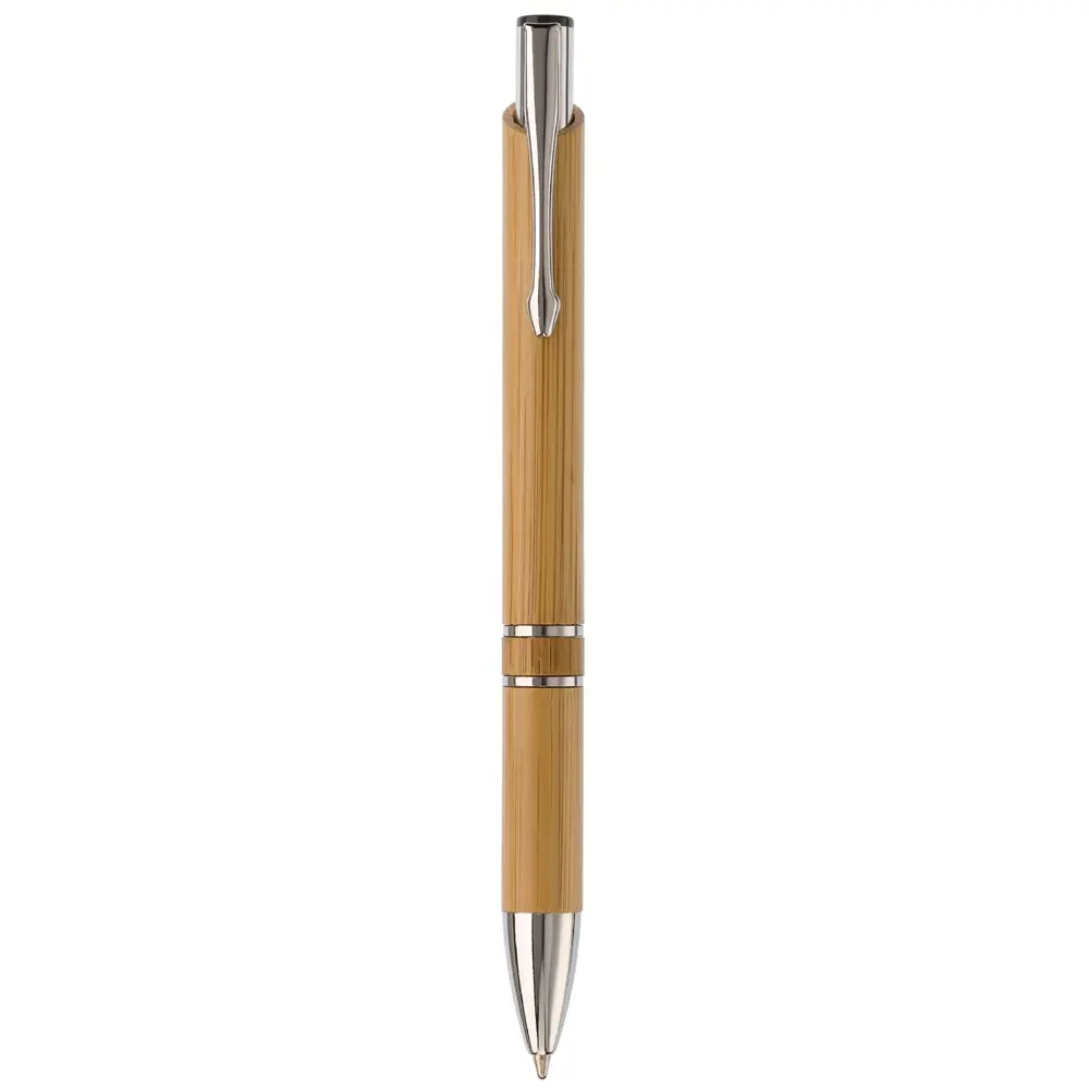 Ontdek onze bamboe balpen, vervaardigd uit hernieuwbare materialen met een metalen clip en gemetaliseerde punt. Deze balpen bevat een zwartschrijvende vulling en voldoet aan Amfori BSCI-normen voor ethische productie. Met een diameter van 11 mm biedt deze pen een comfortabele grip.