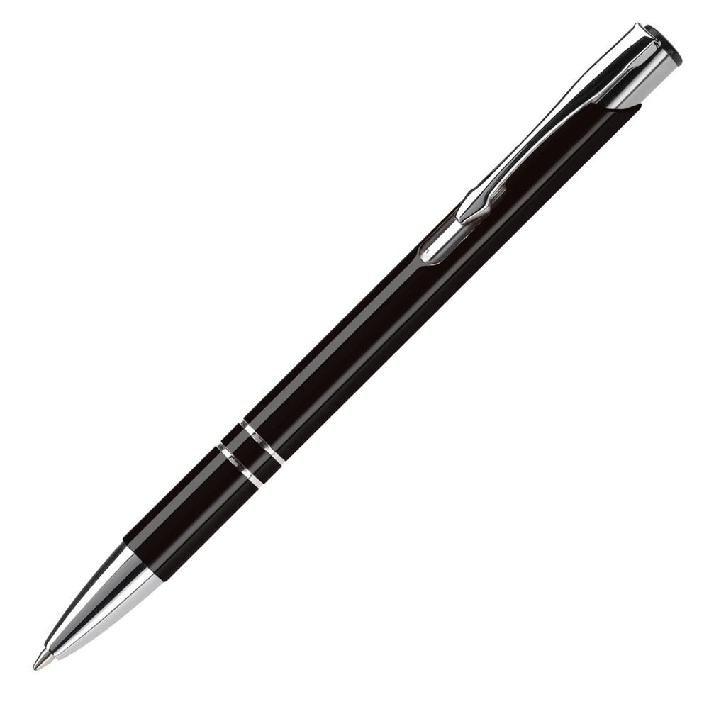 Elegante aluminium balpen. Met twee ringen in het lichaam van de pen als opmerkelijk detail. Blauwschrijvende plastic vulling.