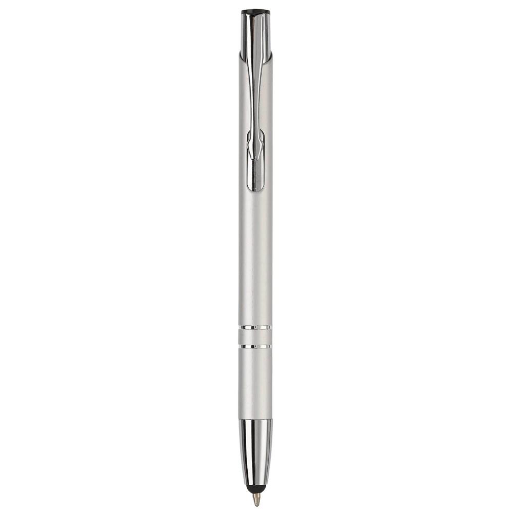 Ontdek deze stijlvolle aluminium balpen met geïntegreerde stylusfunctie, perfect voor jouw marketingacties en events. Het opvallende design met twee ringen in het lichaam geeft de pen een premium uitstraling die indruk maakt bij elke ontvanger.