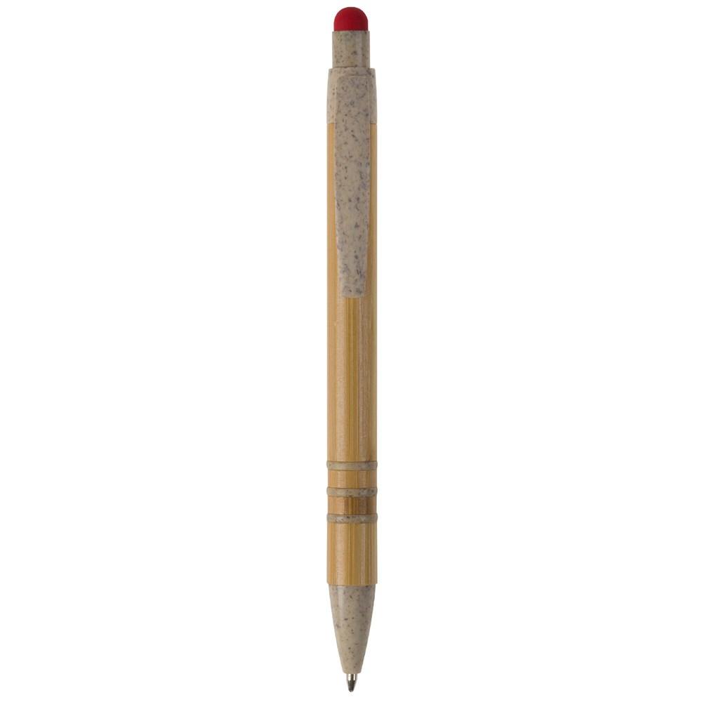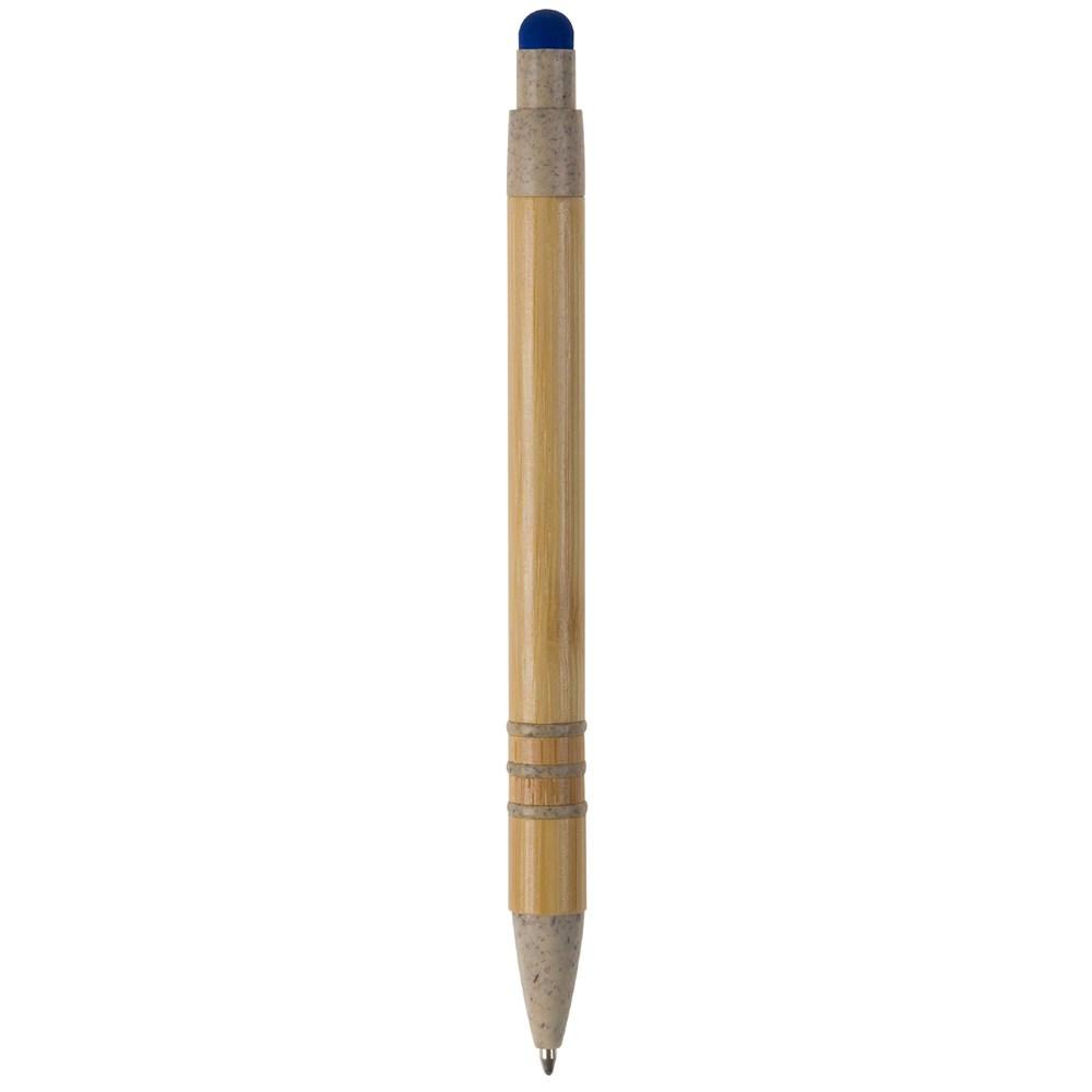 Balpen met bamboe huls. De punt, clip, drukknop en ringen van de huls zijn gemaakt van tarwestro. Op de drukknop zit een gekleurde stylus voor smartphonegebruik. Een veelzijdig promotieartikel, compleet met een blauwschrijvende jumbo-vulling.
