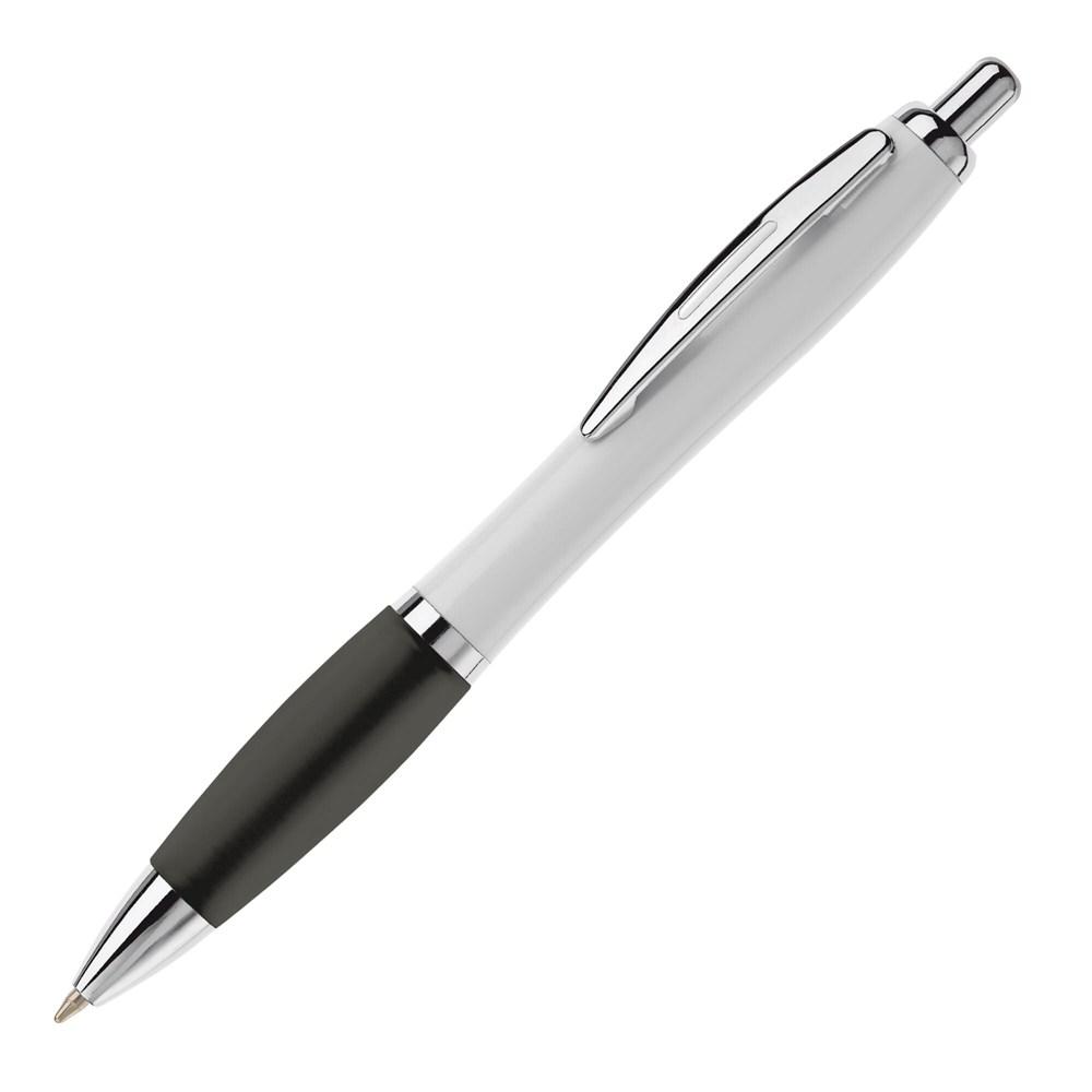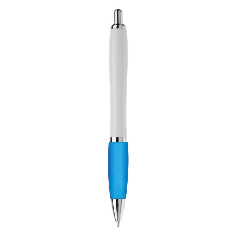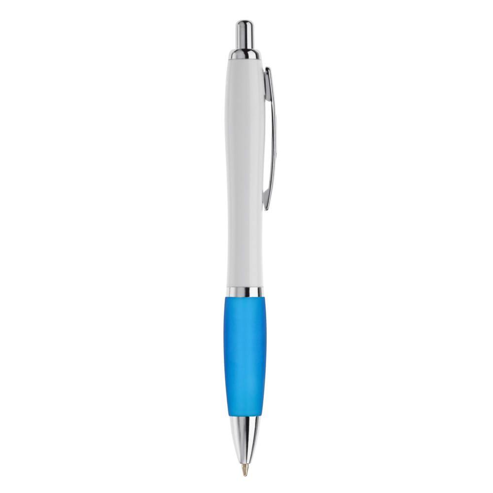 Witte balpen met metalen clip en metal look drukknop, ring en punt. De pen bevat een blauwschrijvende Jumbo vulling.