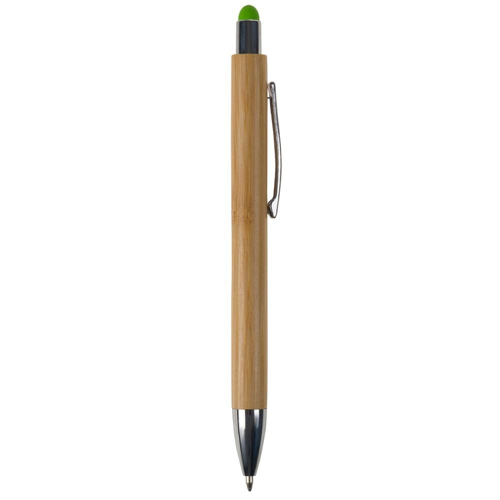 Balpen van bamboe materiaal met gemetalliseerde drukker en punt en metalen clip. De pen bevat een gekleurde stylus om een touchscreen te bedienen. Bevat een blauwschrijvende Jumbo vulling.