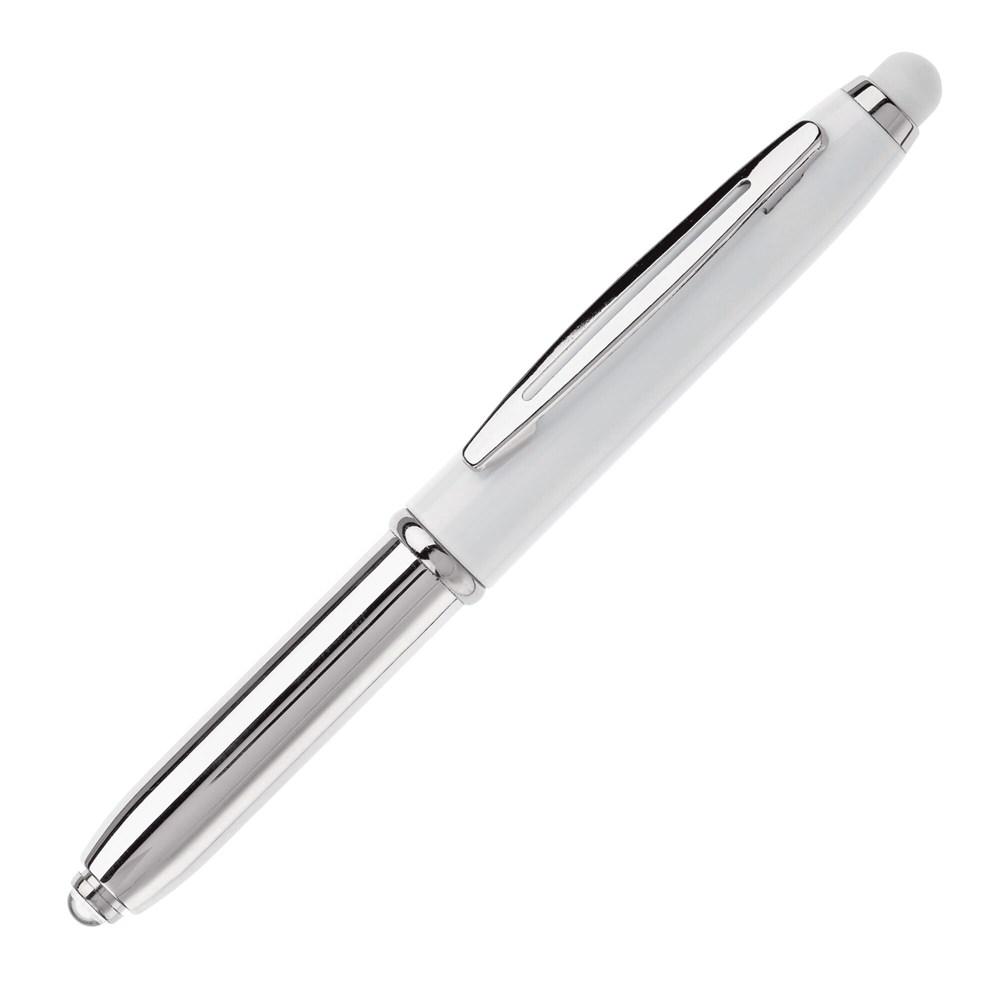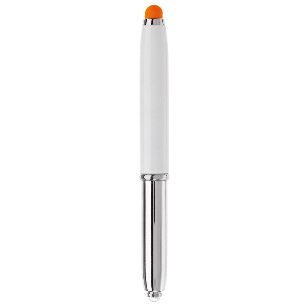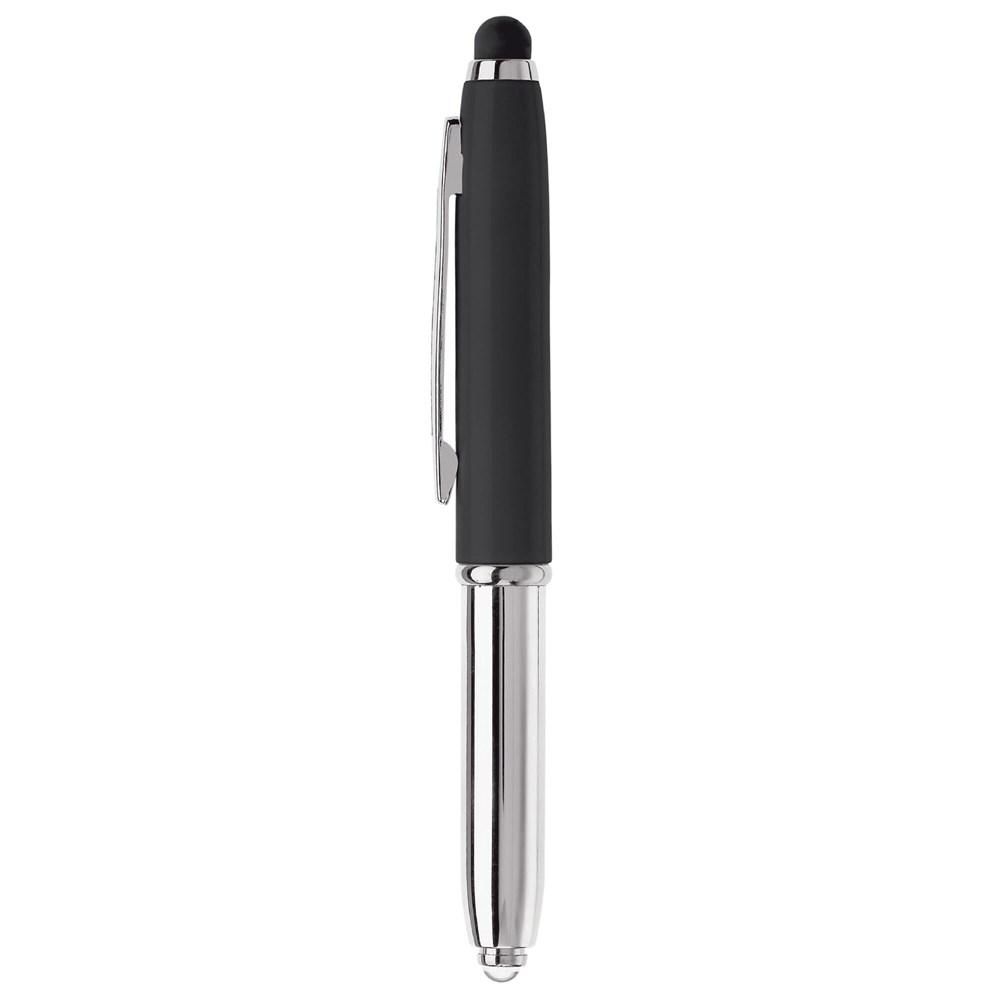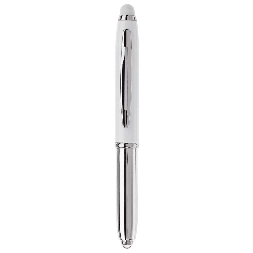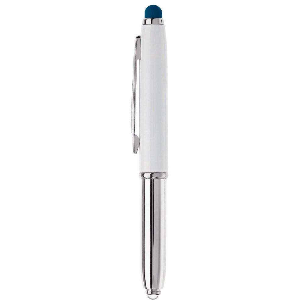 Touchscreen pen met lampje en balpen. Balpen te gebruiken door dop eraf te halen. Blauwschrijvend.