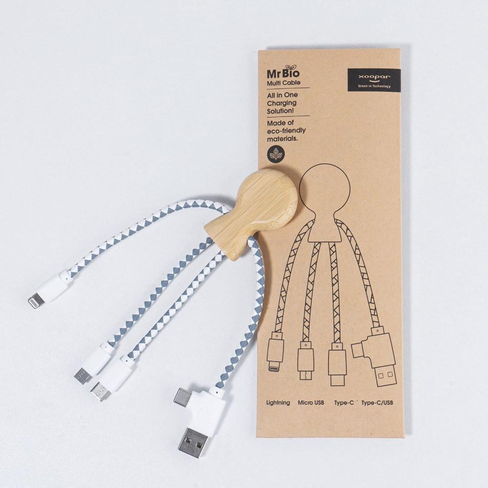 Ontdek de bamboe laadkabel Mr. Bio, jouw veelzijdige multi-oplaadkabel met dubbele USB- en USB-C-ingang plus drie connectoren voor al je apparaten. Gemaakt van robuust bamboe en duurzame DuPont Tyvek-kabels, komt hij in een stijlvolle FSC-papieren envelop die herbruikbaar is.