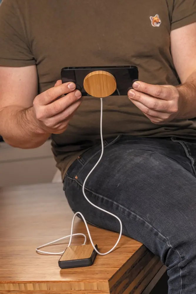 Gemaakt van duurzaam bamboe en PVC-vrije materialen, voldoet dit product aan strenge normen zoals REACH en EU-richtlijnen, met een laag energieverbruik in standby. Personaliseer met uw logo om uw merk te versterken bij klanten – perfect voor uitdeling tijdens bijeenkomsten. Inclusief 100 cm TPE micro-USB-kabel voor directe aansluiting.