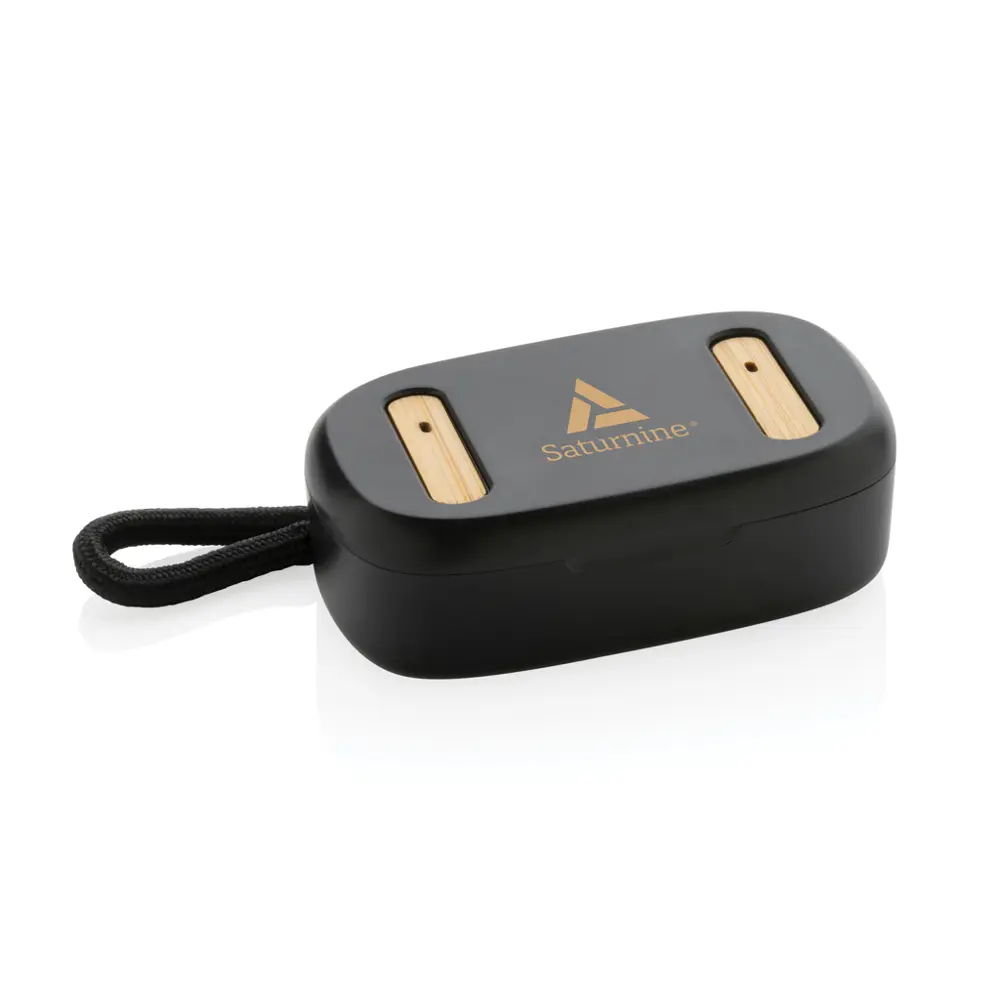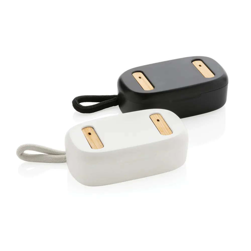 Ontdek onze next generation FSC® 100% bamboe draadloze TWS oordopjes met RCS gerecyclede ABS oplaadcassette, ideaal als gepersonaliseerd relatiegeschenk voor uw bedrijf. Met 58% gerecycled materiaal en RCS-certificering verzekert u een duurzame keuze die uw merk ecologisch verantwoord profileert. De oordopjes bieden een perfecte pasvorm met 40 mAh batterij, oplaadtijd van 1 uur in de 400 mAh cassette, en speelduur van circa 5 uur op gemiddeld volume. Dankzij Bluetooth 5.3 geniet u van een stabiele verbinding tot 10 meter, met automatische koppeling, ingebouwde microfoon en pick-up functie.