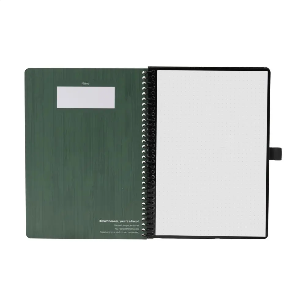 Ontdek het Bambook Classic Original Dot Grid Notebook A5, uw ideale gepersonaliseerde relatiegeschenk met logobedrukking. Dit uitwisbare notitieboek in A5-formaat biedt een stevige, buigzame cover van FSC-gecertificeerd karton met subtiel bamboepatroon, en 20 vel (40 pagina's) whiteboardpapier met dot grid raster voor precieze notities.