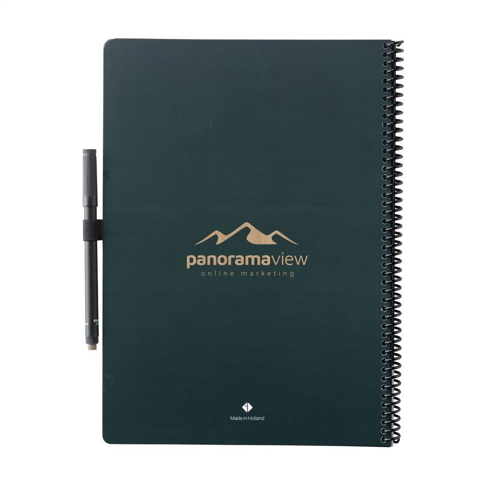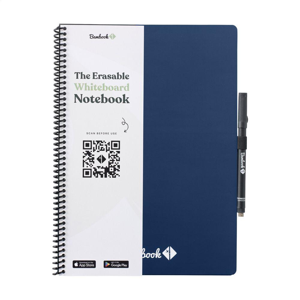 Bambook Classic Original uitwiswaar notitieboek in A4-formaat. Met stevige buigzame cover van FSC gecertificeerd karton bedrukt met een subtiel bamboe patroon en 20 vel/40 pagina's uitwisbaar, gelinieerd papier. Schrijf met de speciale marker op de whiteboard pagina's, scan je aantekeningen met de Bambook app en wis je pagina's, met een vochtig doekje, schoon voor hergebruik. Met wiro-o-binding en penlus. Inclusief pen met gum. Het notitieboek is met de hand gemaakt. Made in Holland.