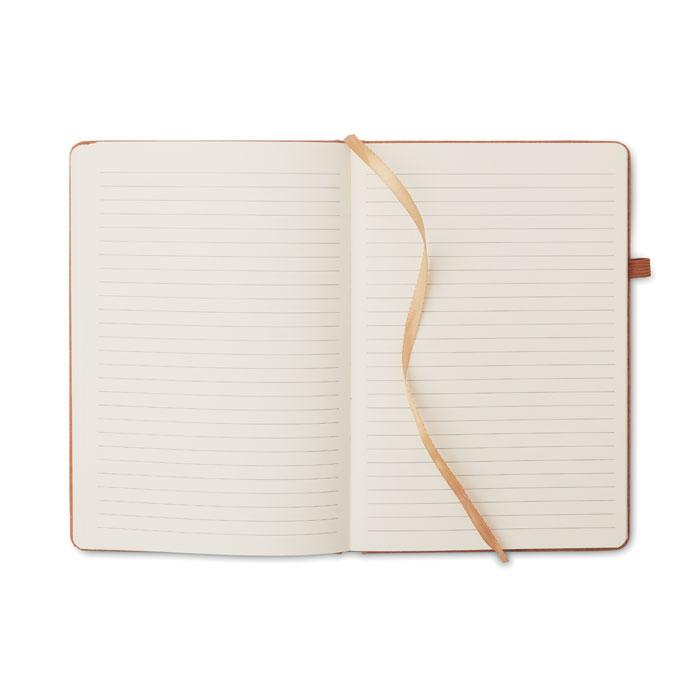 A5 notitieboek met 70% gerecycled leer en 30% PU latex kaft. Gebonden in etui. 160 gelinieerde pagina's gerecycled papier (80 vellen). Bijpassende elastische sluitingsband en penhouder.