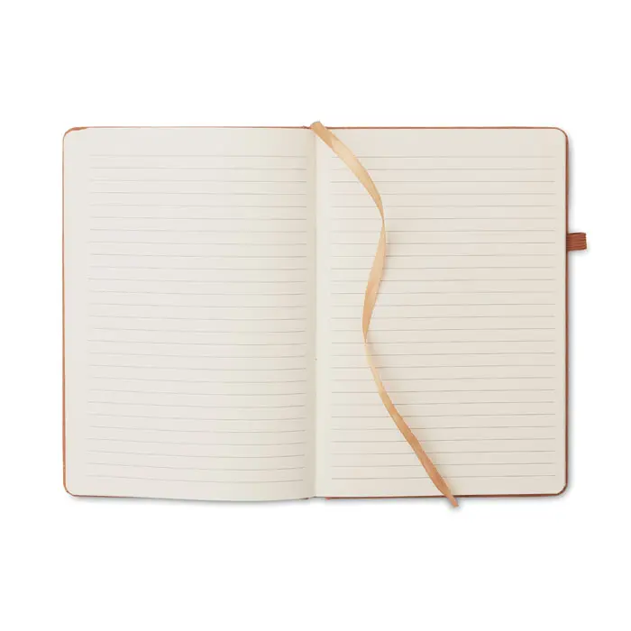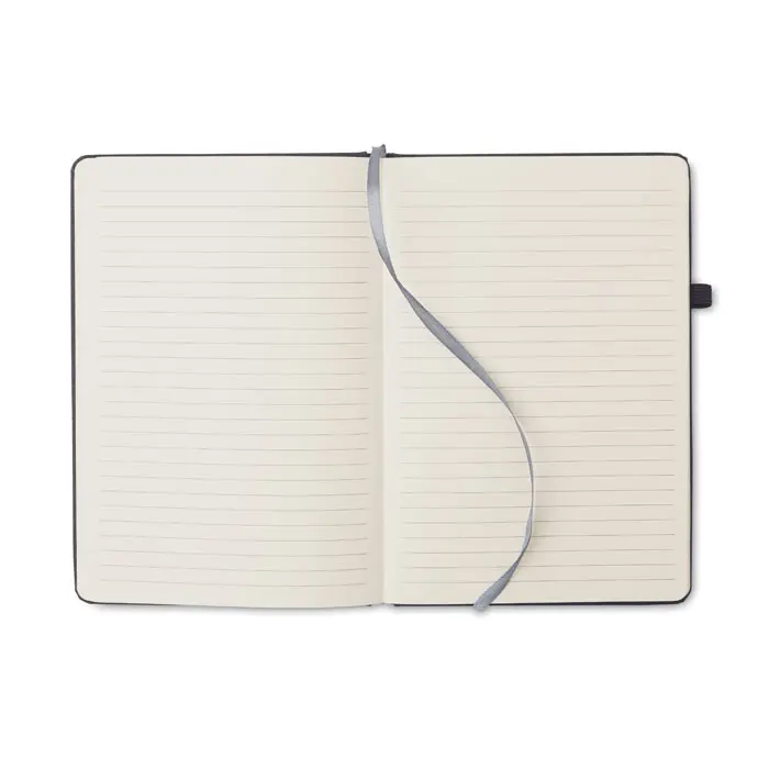 Dit A5 notitieboek is vervaardigd uit 70% gerecycled leer en 30% PU latex voor de kaft, gecombineerd met 160 gelinieerde pagina's van gerecycled papier (80 vellen). Het is gebonden in een etui met een bijpassende elastische sluitingsband en penhouder. Door de gerecyclede materialen draagt u bij aan een groener imago voor uw merk, terwijl de hoge kwaliteit zorgt voor langdurig gebruik.
