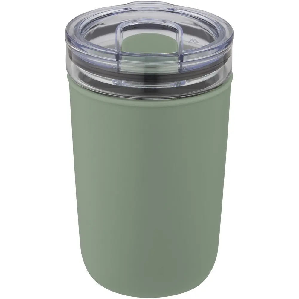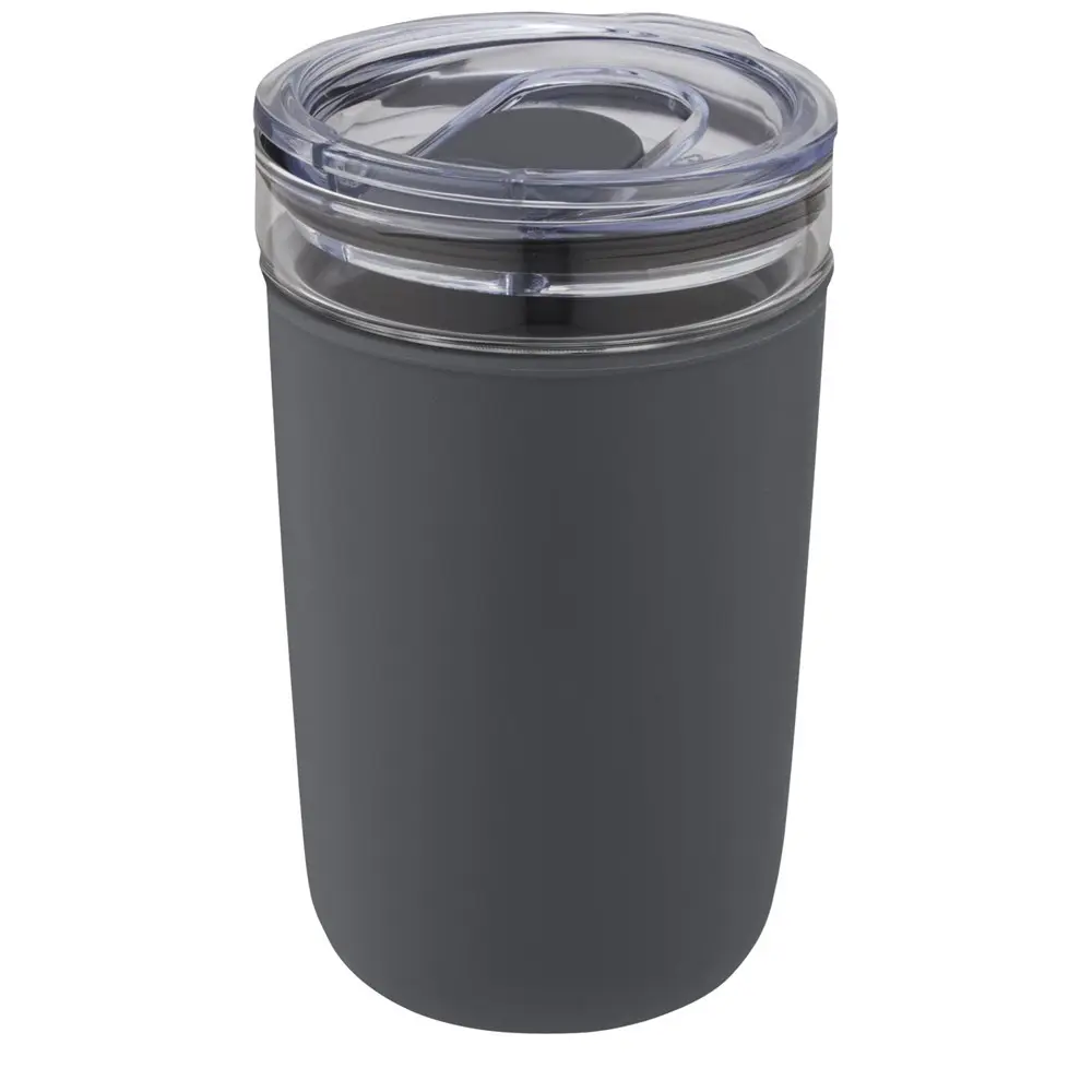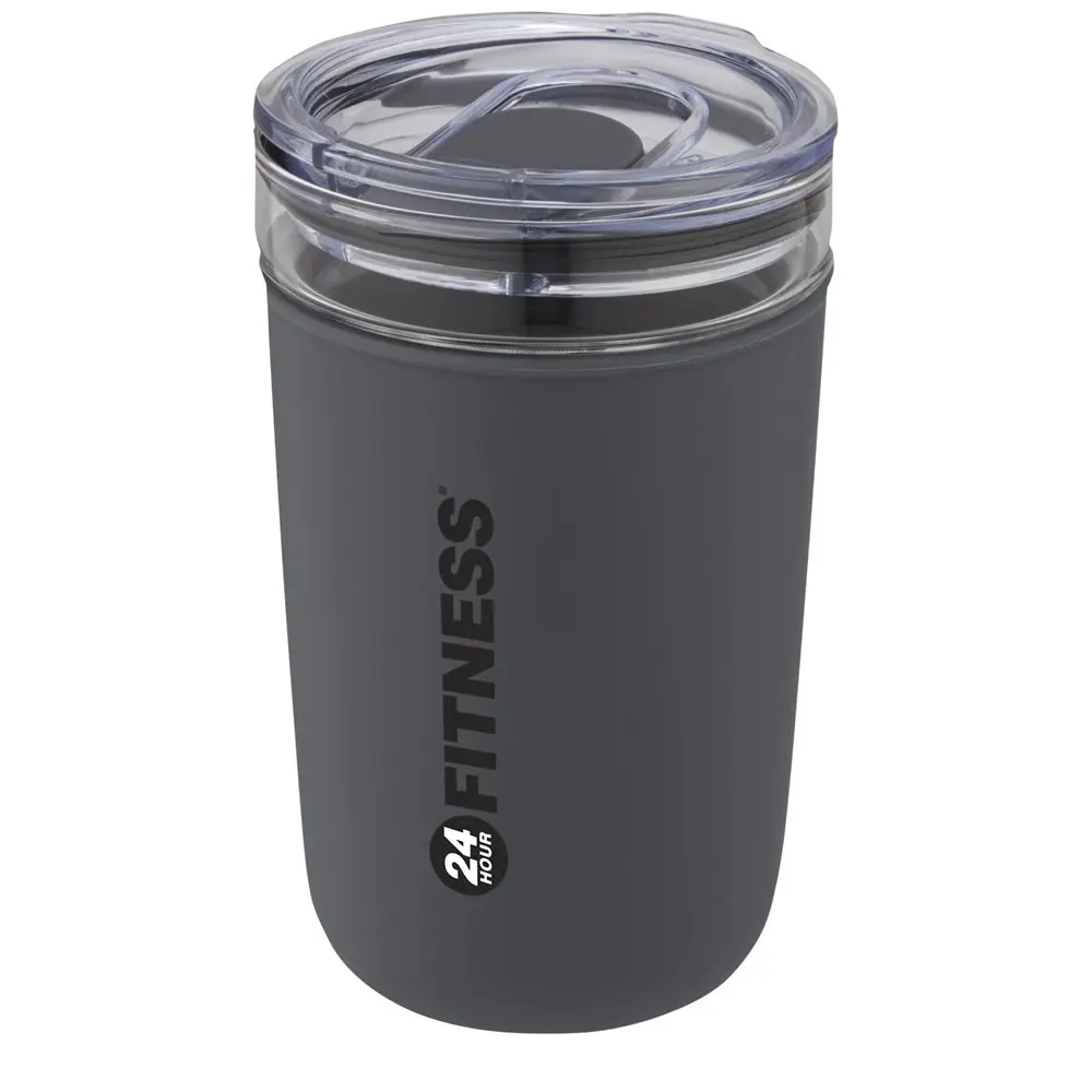 Ontdek deze hoogwaardige glazen beker, ideaal als gepersonaliseerd relatiegeschenk voor uw bedrijf. Met een beschermende hoes van gerecycled plastic biedt hij optimale bescherming tijdens transport en gebruik. Gemaakt van 100% borosilicaatglas behoudt hij de versheid en smaak van uw drank, zonder schadelijke chemicaliën. BPA-vrij en getest volgens de Duitse LFGB-voedselveiligheidswetgeving en REACH-regelgeving voor ftalaten, garandeert hij de hoogste veiligheidsnormen. De beker past perfect onder de meeste koffiemachines en heeft een inhoud van 420 ml. Verwijder de hoes voor vaatwasmachinebestendigheid. Levering in een gerecyclede kartonnen geschenkverpakking.
