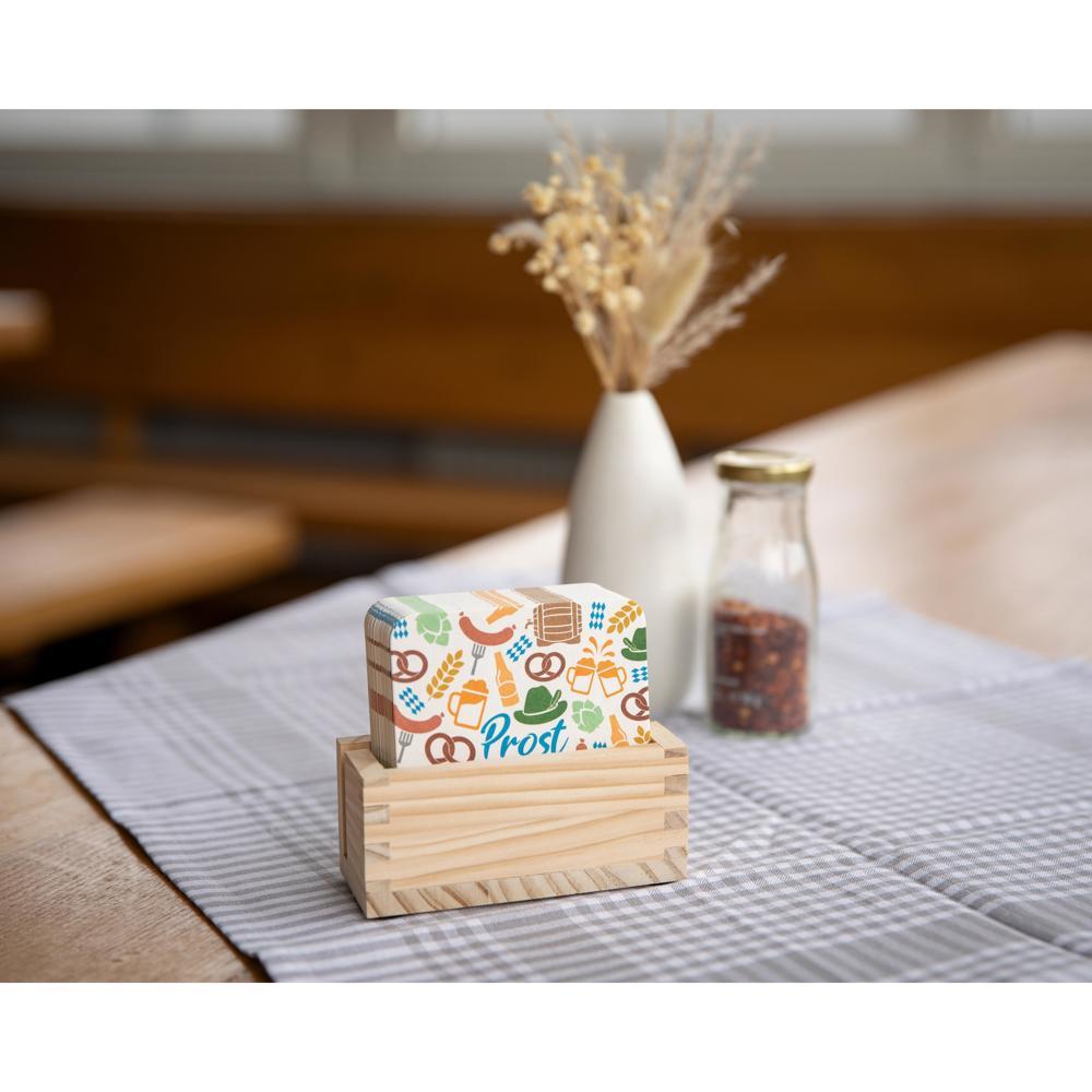 De bierviltjeshouder Gastro trekt meteen de aandacht op elke tafel en dient als praktische menukaartenhouder en bieronderzetterhouder in één. Gemaakt van robuust grenenhout past hij perfect in horeca-omgevingen en straalt stijl en kwaliteit uit. Met vier antislipvoetjes staat hij stevig en voorkomt hij ongelukken, ideaal voor drukke events.