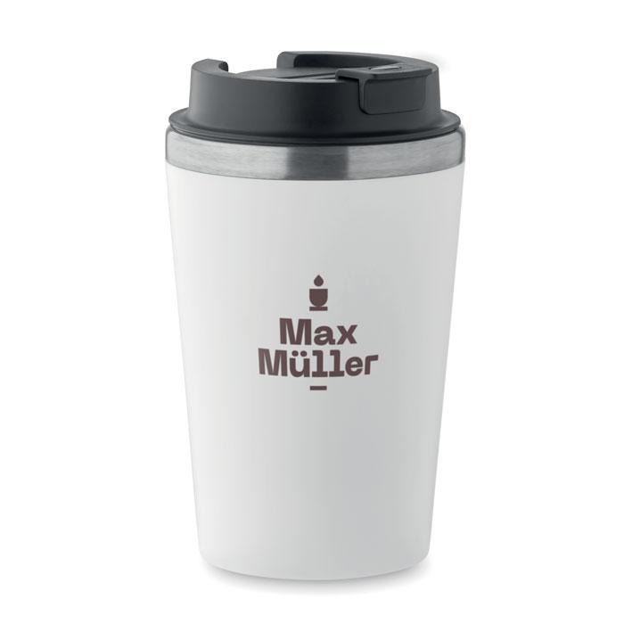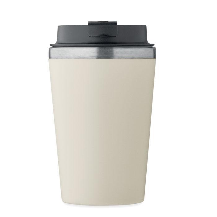 Dubbelwandige beker in PP buitenwand met binnenwand in gerecycled roestvrij staal (90% gerecycled roestvrij staal en 10% roestvrij staal) met een keramische binnenlaag. Lekvrij. Inhoud: 350ml.