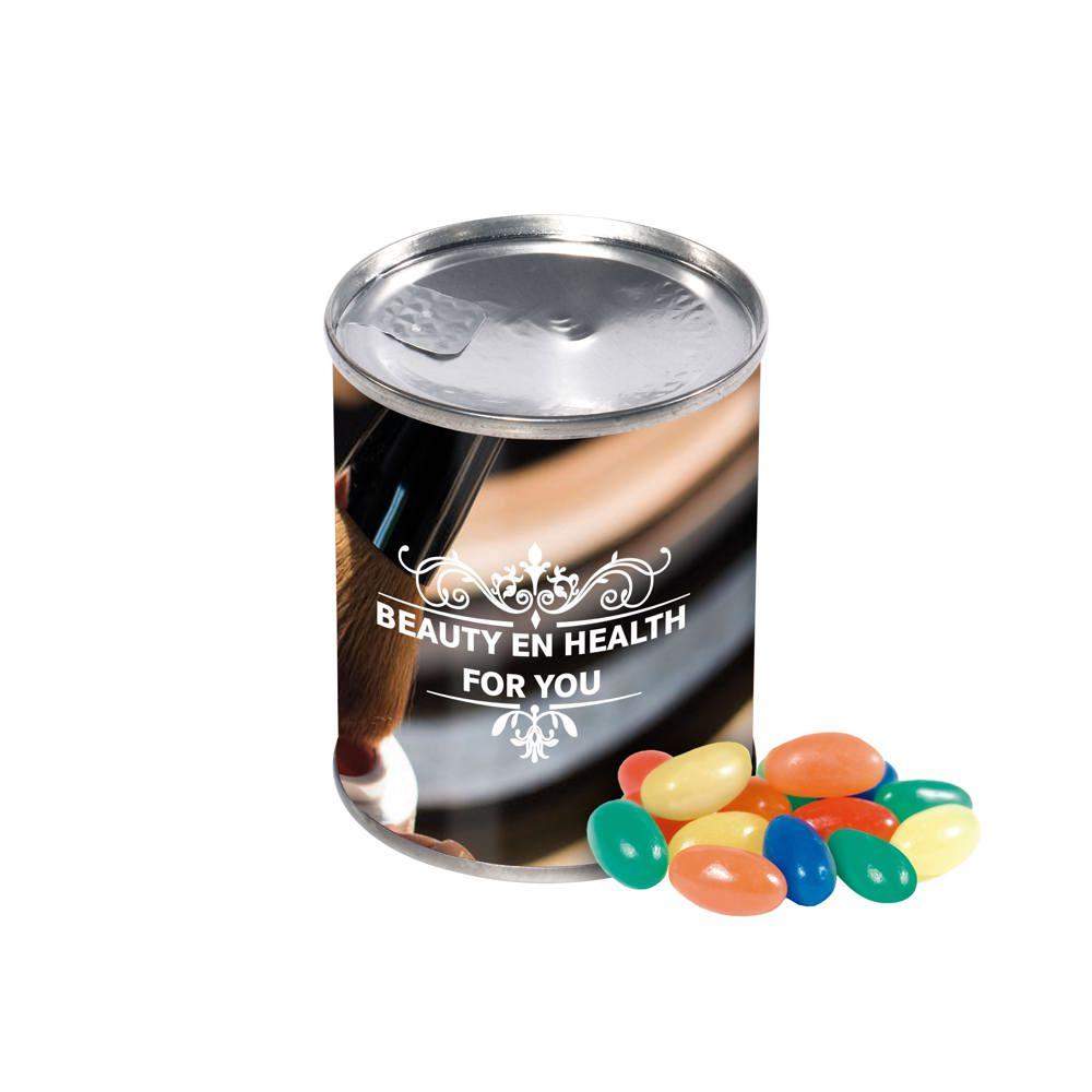Blikje met ca. 65 gram jelly beans en voorzien van een rondom geplakte full colour bedrukte sticker