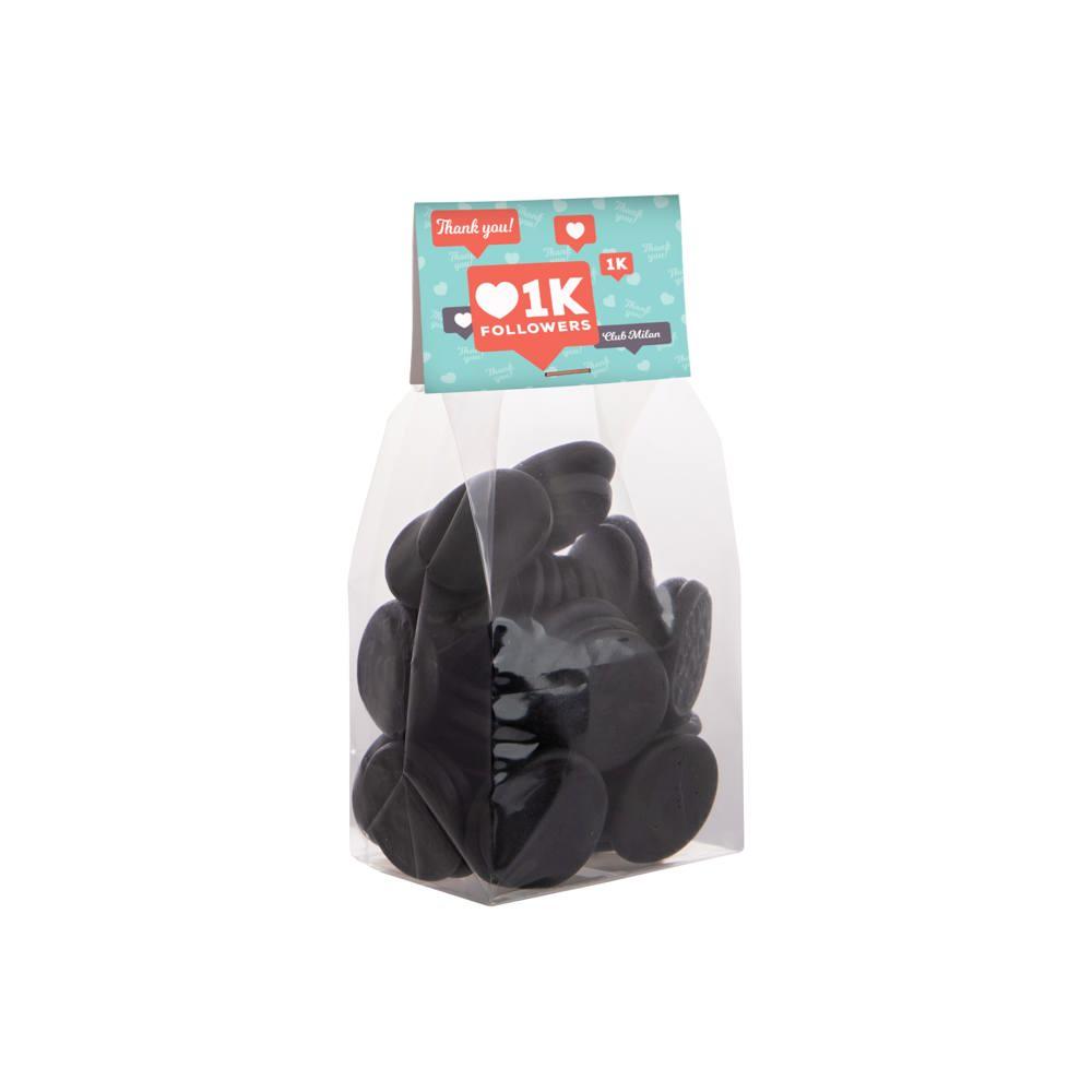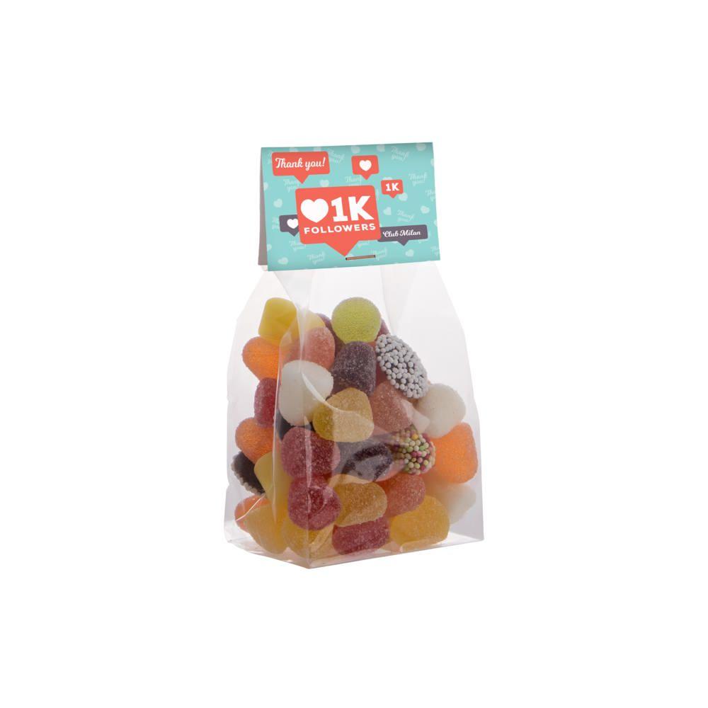 Dit blokzakje met kopkaartje en 150 gram snoep is jouw ideale relatiegeschenk voor events en promoties. Het transparante zakje toont de smakelijke dropstaafjes mix duidelijk, wat direct de aandacht trekt van je doelgroep. Personaliseer het full colour kopkaartje met je logo en boodschap voor maximale zichtbaarheid en merkherinnering.