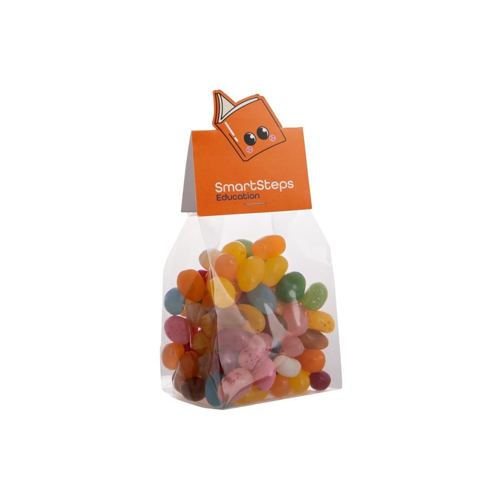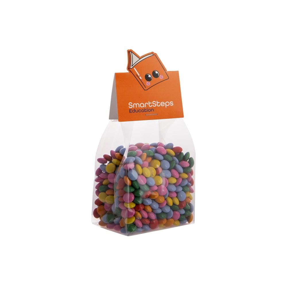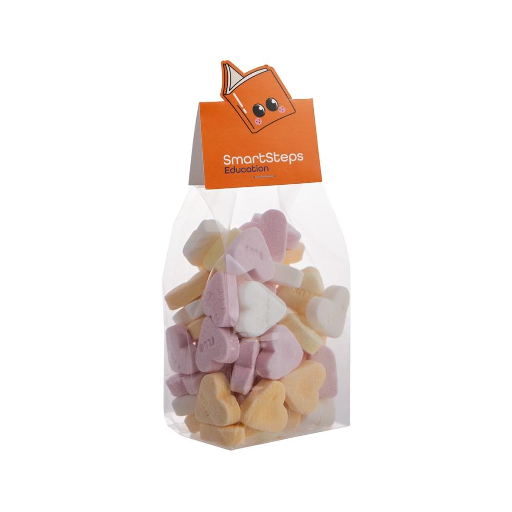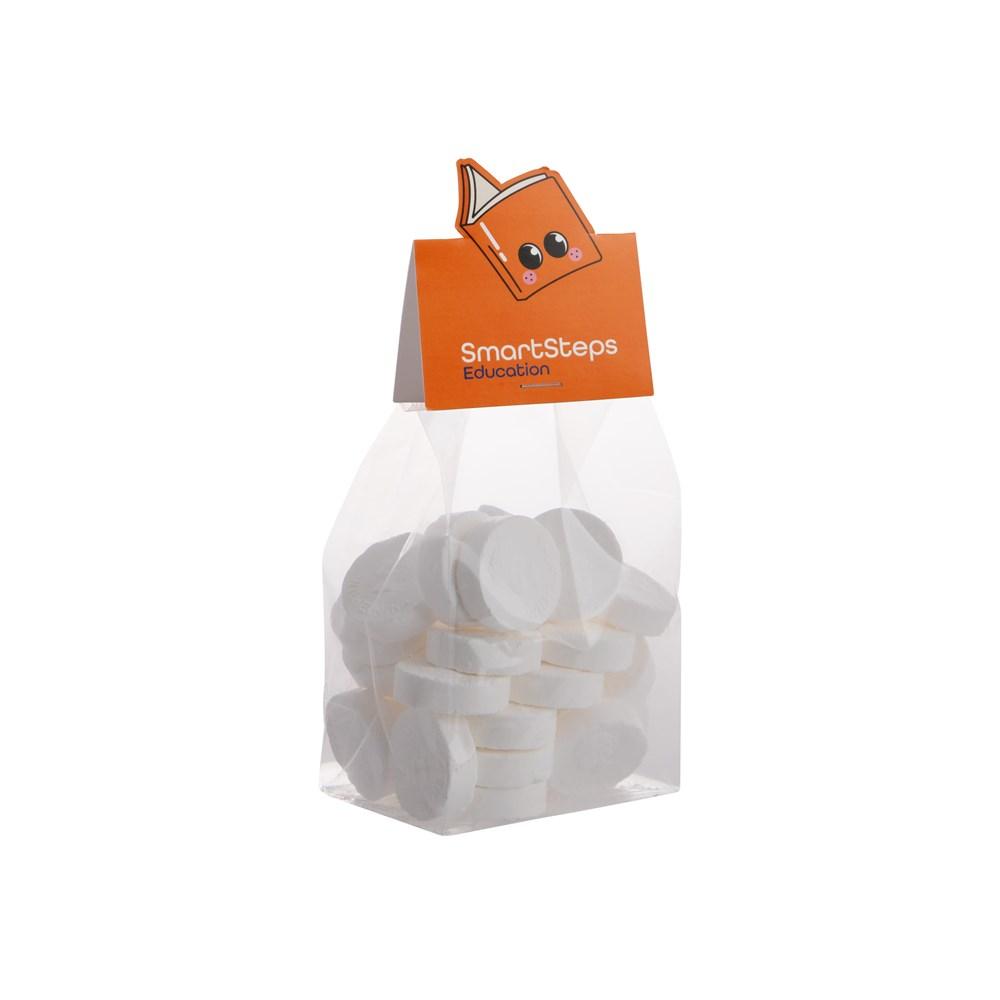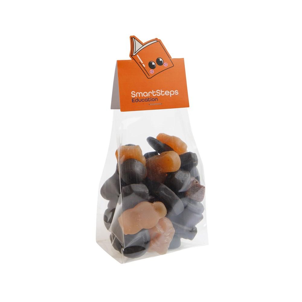 Transparant blokzakje met full colour bedrukt kopkaartje in eigen vorm, gevuld met 150 gram Imperiales