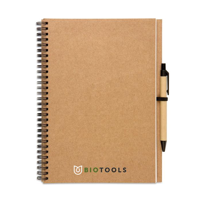 Je ontvangt een handig notitieblok met 140 blanco pagina's (70 vellen) van gerecycled papier, inclusief een biologisch afbreekbare en gerecyclede balpen. Dit duurzame setje is ideaal als gepersonaliseerd relatiegeschenk voor je events of marketingacties.