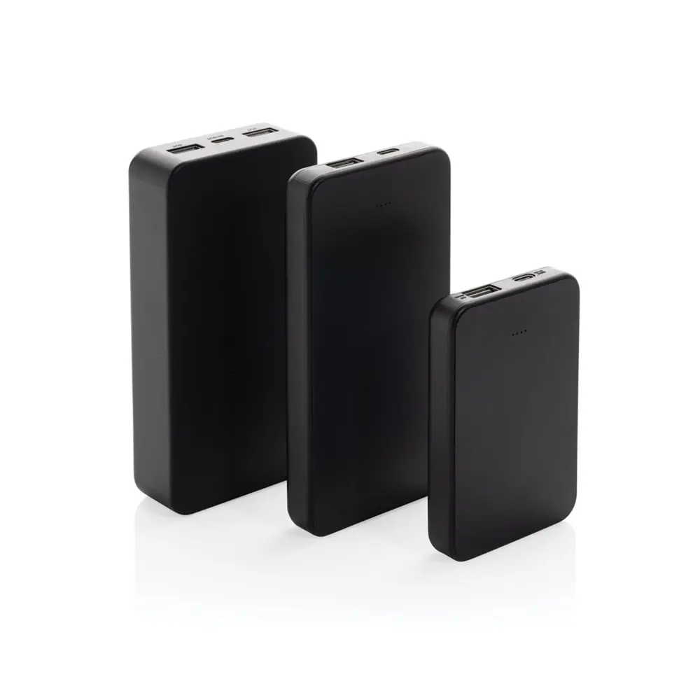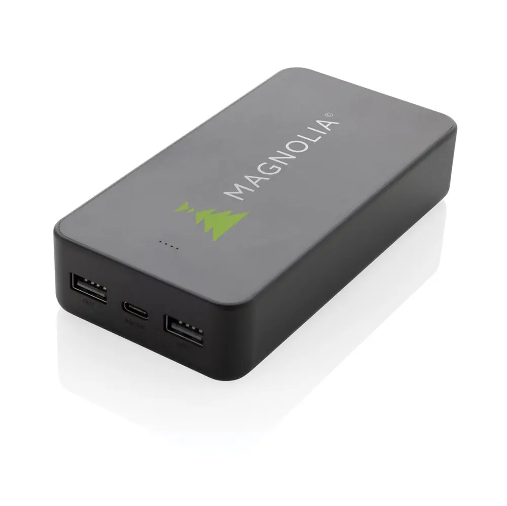 Ontdek deze robuuste powerbank met een capaciteit van 20.000 mAh, ideaal als gepersonaliseerd relatiegeschenk. Gemaakt van RCS-gecertificeerd gerecycled ABS-plastic, bevat het product 12% gerecycled materiaal op basis van het totale gewicht. Dit ondersteunt uw duurzame bedrijfsvisie en toont uw engagement voor het milieu. De PVC-vrije constructie en bijbehorende accessoires, inclusief RCS-gecertificeerde gerecyclede TPE-oplaadkabel, zorgen voor een ecologisch verantwoorde keuze.