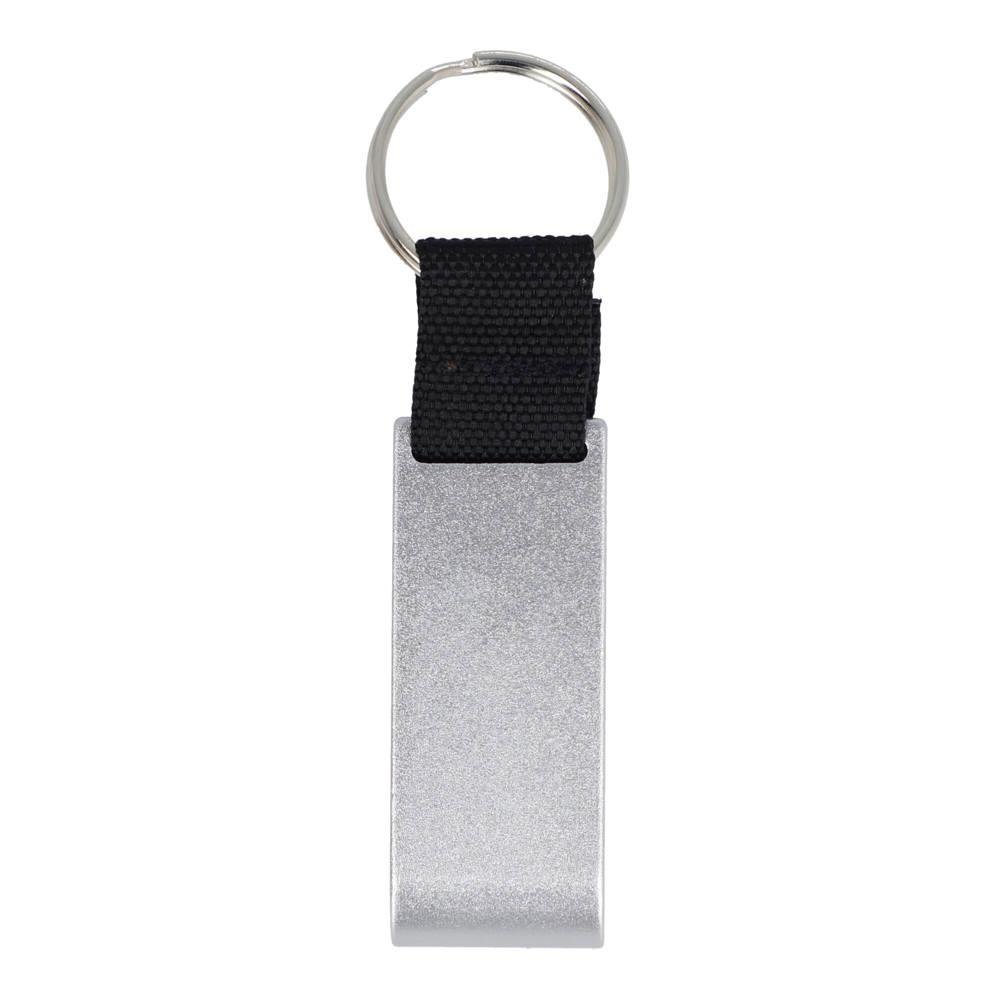 Aluminium 3-in-1 sleutelhanger met flesopener, telefoonstandaard en afneembare winkelwagenmunt, geschikt voor de meeste winkelwagens in West-Europa. Een compact en praktisch promotieartikel.