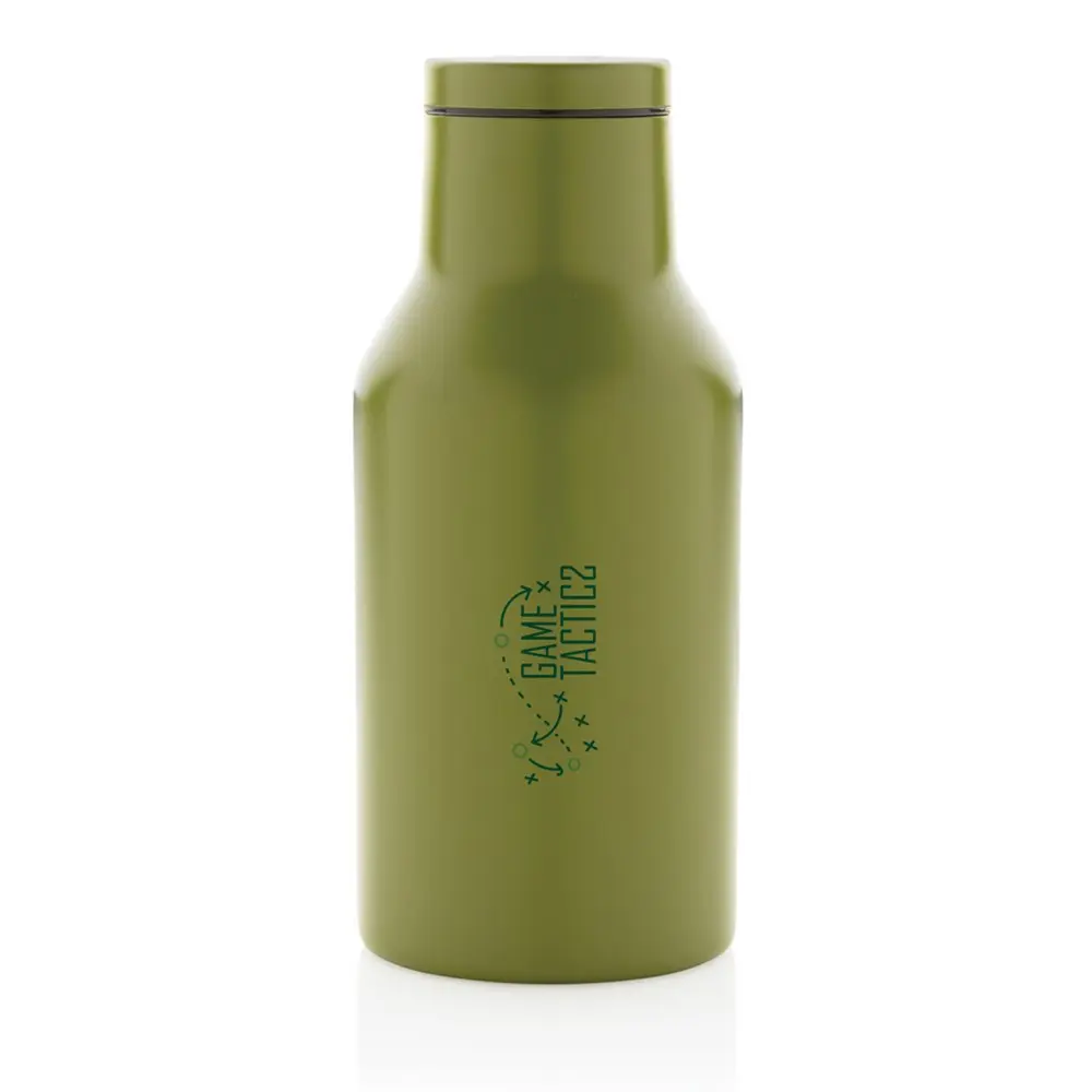 De dubbelwandige constructie houdt uw dranken tot 3 uur warm of 6 uur koud, wat deze fles uitermate geschikt maakt voor events en dagelijkse promotie. Met een capaciteit van 0,3 liter en een diameter van 68 mm is hij compact en gemakkelijk mee te nemen. Het schroefdeksel met brede opening vereenvoudigt het vullen en schoonmaken, zodat uw klanten deze fles probleemloos kunnen gebruiken. Als gepersonaliseerd relatiegeschenk met logobedrukking versterkt hij uw merkherkenning tijdens netwerkevents of als bedankje aan relaties.