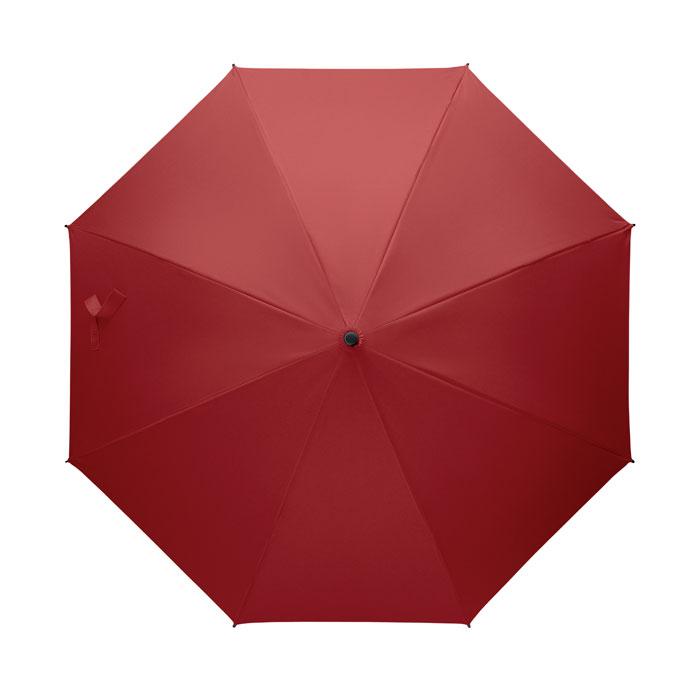 23 inch rechte automatisch openende paraplu met zwart metalen frame, glasvezel baleinen en panelen in 190T pongee stof. Plastic tips en bovenkant. Met rubber bekleed PP plastic gebogen handgreep. Handmatige sluiting.