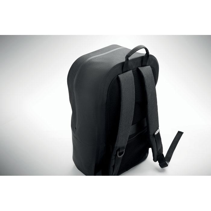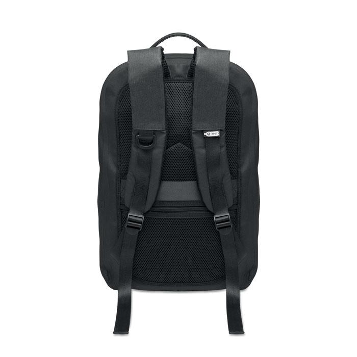 16 inch laptoprugzak van 300D RPET polyester en 210D polyester voering. Waterbestendige stof. Verborgen vak met rits en trolleyhouder op de rug. Gewatteerd intern laptopvak, achterkant van mesh en schouderband.