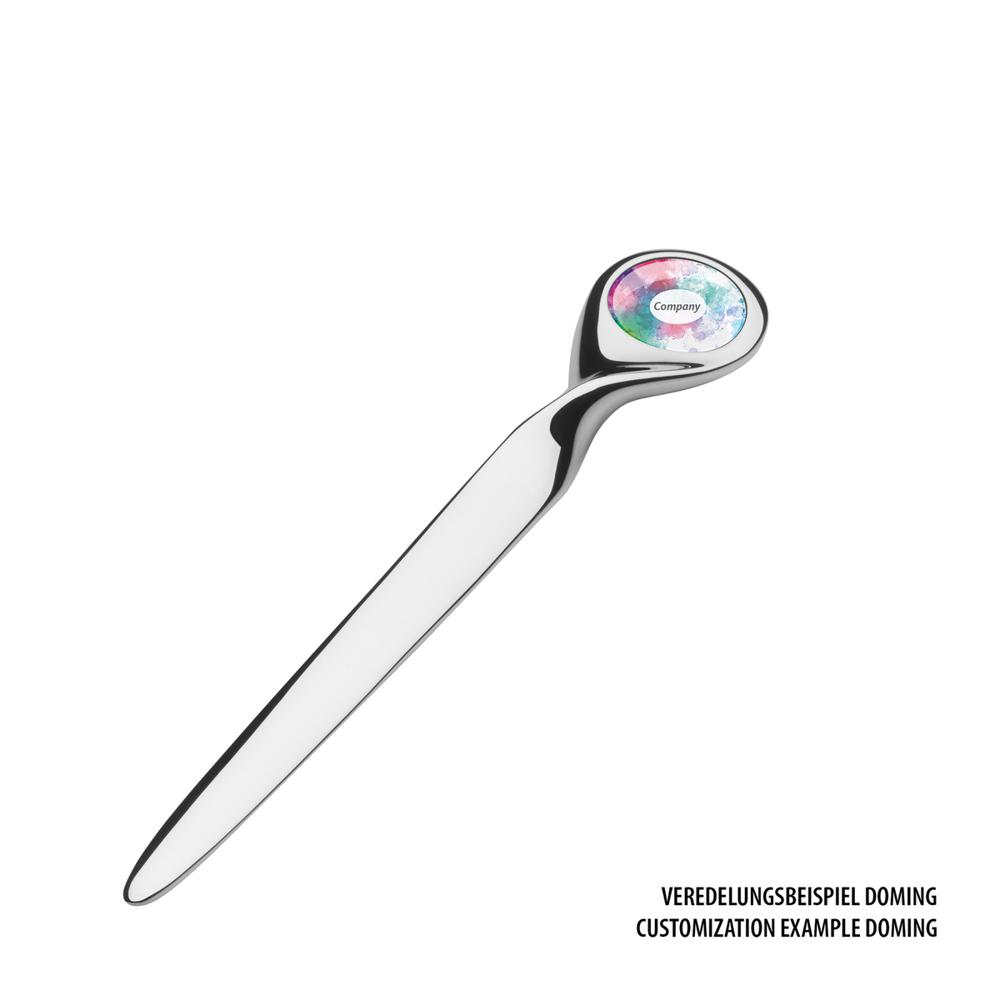 De glanzend zilveren briefopener is ideaal voor lasergravering of indrukwekkende doming. De bovenkant van de opener heeft een opvallend, rond domingoppervlak. De volledig metalen opener ligt goed en comfortabel in de hand en wordt in een geschenkverpakking geleverd.