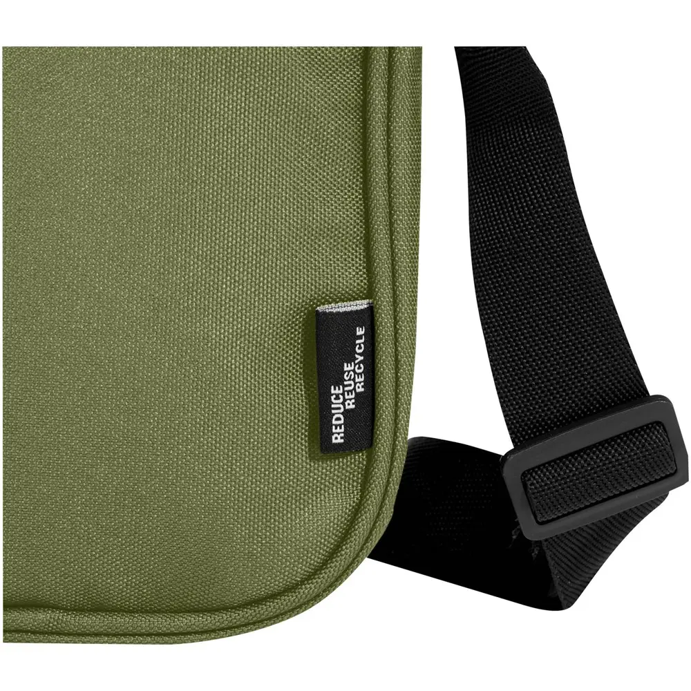 De Byron crossbodytas van 2 liter is een praktische en waterafstotende keuze uit GRS-gecertificeerd gerecycled polyester, ideaal voor uw marketingacties en events. Met afmetingen van 17 x 23,5 x 5 cm biedt deze tas een compact compartiment met ritssluiting voor uw dagelijkse gadgets, een binnenvak voor veilige opslag, een voorvak met rits voor sleutels en accessoires, en een open achtervak voor snelle toegang. De verstelbare schouderband zorgt voor comfortabel dragen.