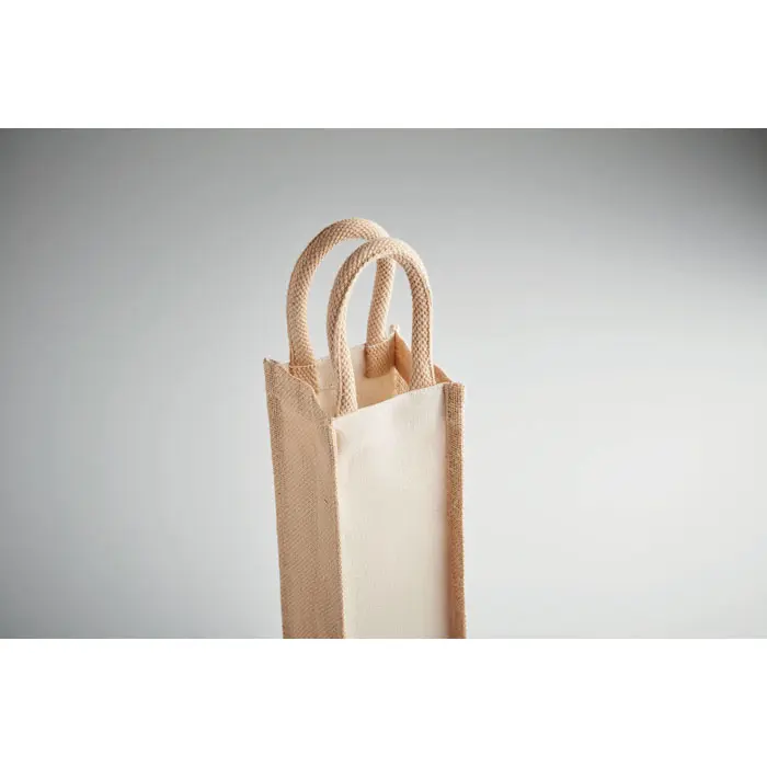 Ontdek de ideale oplossing voor uw relatiegeschenken met deze stijlvolle wijntas van jute. Gemaakt van robuust jute en versterkt met 320 gr/m² canvas, biedt deze tas een duurzame en elegante presentatie voor een enkele wijnfles. Perfect voor marketingacties, events en bedrijfspromoties, waar u uw merk op een milieubewuste manier kunt uitdragen.