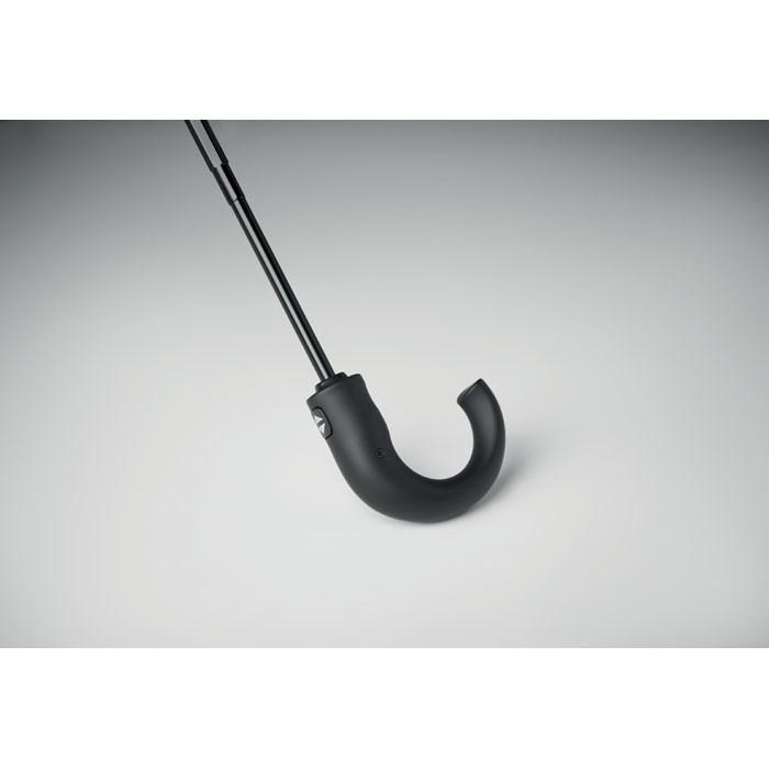 23 inch 3-voudige windbestendige auto open/close paraplu in dubbellaags 190T pongee met geruit binnenpatroon. Zwart geplastificeerd frame en schacht. Tweedelig zwart glasvezel vernikkeld middenstuk. Gebogen handvat van ABS met rubber.