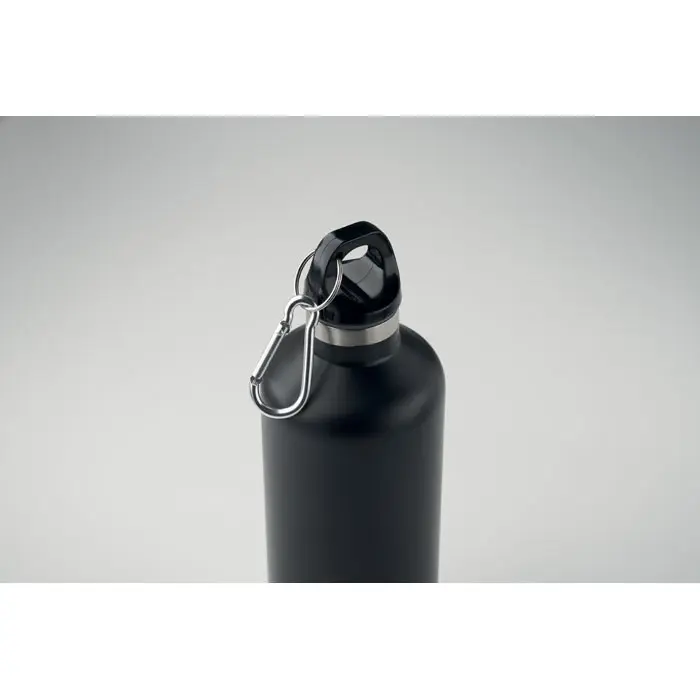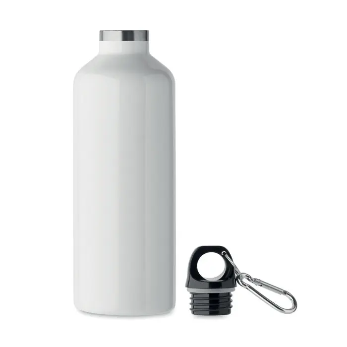 Ontdek onze dubbelwandige vacuüm isolerende fles van 500 ml, vervaardigd uit gerecycled roestvrij staal. Dit duurzame product combineert 90% gerecycled roestvrij staal met 10% nieuw roestvrij staal, wat het een milieuvriendelijke keuze maakt voor uw bedrijf. De fles is lekvrij en uitgerust met een handig karabijnhaak deksel, ideaal voor onderweg. Let op: de karabijnhaak is niet geschikt voor klimmen of professioneel gebruik.